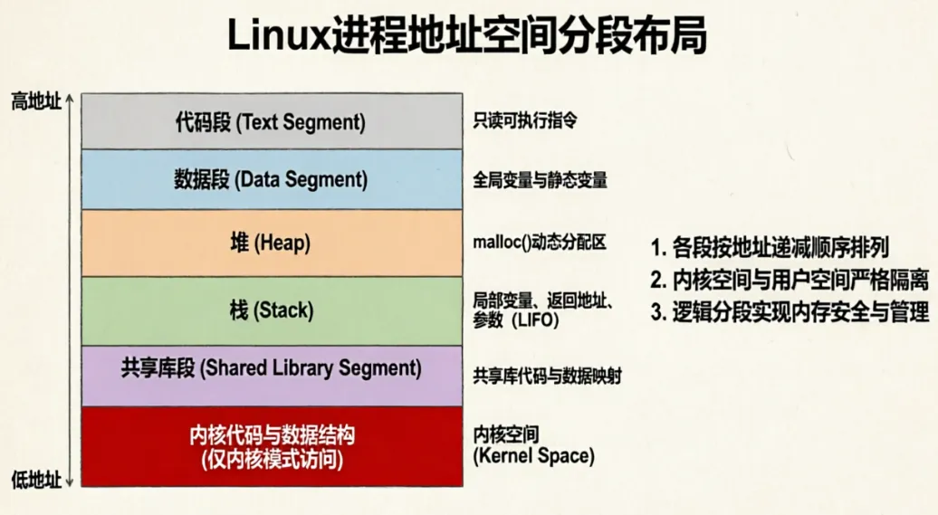 此外,进程地址空间还包括共享库段(Shared Library Segment)和内核空间(Kernel Space),前者用于映射共享库代码和数据,后者则包含操作系统内核的代码和数据结构,仅供内核模式下的程序访问。通过这种分段的布局方式,Linux 系统不仅实现了内存的有效管理,还为进程提供了清晰的逻辑视图,从而简化了程序设计和调试过程。