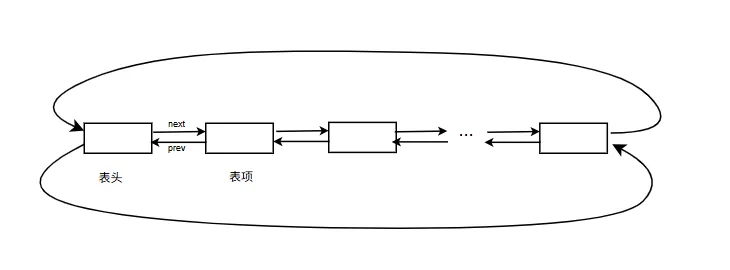 链表由表头和表项构成,二者均使用 struct list_head 结构体。每个表项(或表头)里都有前向指针,后向指针,方便遍历。示意图如下: