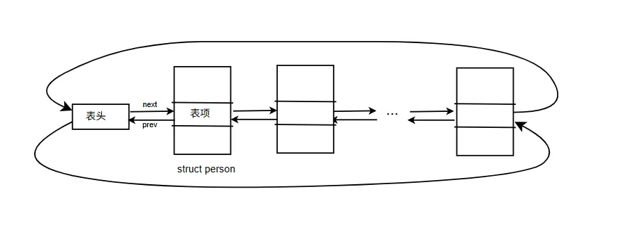 术语统一:本文中“表项”指 struct list_head 结构体,“节点”指被嵌入的父结构体(如 struct person)。prev 称前向指针,next 称后向指针。