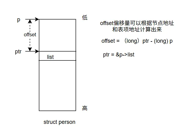 offset = (long)&((struct person*)NULL)->list - (long)NULL;//简化后offset = (long)&((struct person*)NULL)->list//知道了offset值,表项的地址减去offset就是节点的地址p = (long)ptr - (long)&((struct person*)NULL)->list