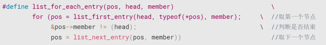 /** * list_for_each_entry - iterate over list of given type * @pos: the type * to use as a loop cursor. * @head: the head for your list. * @member: the name of the list_head within the struct. */#define list_for_each_entry(pos, head, member) \ for (pos = list_first_entry(head, typeof(*pos), member); \ &pos->member != (head); \ pos = list_next_entry(pos, member))