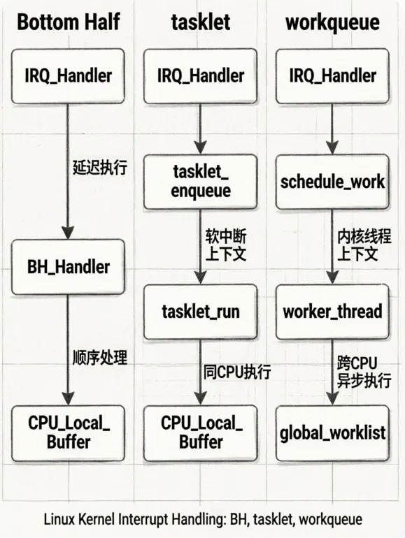 Linux内核中的**Bottom Half(下半部)机制是中断处理的关键设计,用于将非紧急任务延迟执行,避免长时间占用中断上下文,从而保证系统实时性和响应能力。tasklet和工作队列(workqueue)**是实现Bottom Half的两种主要机制,它们在执行上下文、并发能力、适用场景等方面有显著区别。