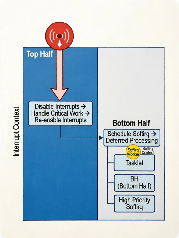 Linux内核将中断处理分为上半部和下半部的核心思想是:快速响应、延迟处理、上下文分离、分层抽象。上半部仅完成紧急、关键路径任务,确保中断响应的实时性;下半部则将非紧急、耗时任务延迟执行,保证系统整体吞吐量和稳定性。这种设计已成为现代操作系统中断处理的基础范式,也是理解Linux驱动开发和内核调度的关键。
