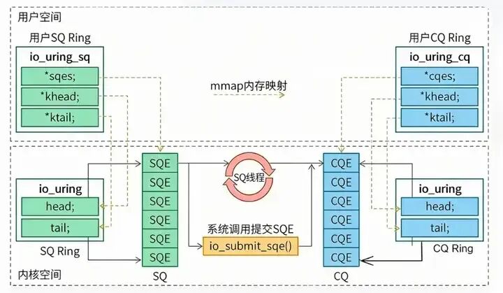 - 数据拷贝次数多:传统 I/O 在数据传输过程中,数据往往需要在用户空间和内核空间之间多次拷贝。以从磁盘读取数据到用户程序为例,数据先从磁盘复制到内核缓冲区,再从内核缓冲区复制到用户缓冲区。而 io_uring 通过共享内存机制,用户态和内核态共享提交队列(SQ)和完成队列(CQ),避免了不必要的数据拷贝。当用户态提交 I/O 请求时,直接将请求参数写入共享内存中的 SQ,内核态从 SQ 中获取请求并执行,执行完成后将结果写入 CQ,用户态从 CQ 中读取结果,整个过程大大减少了数据拷贝次数。