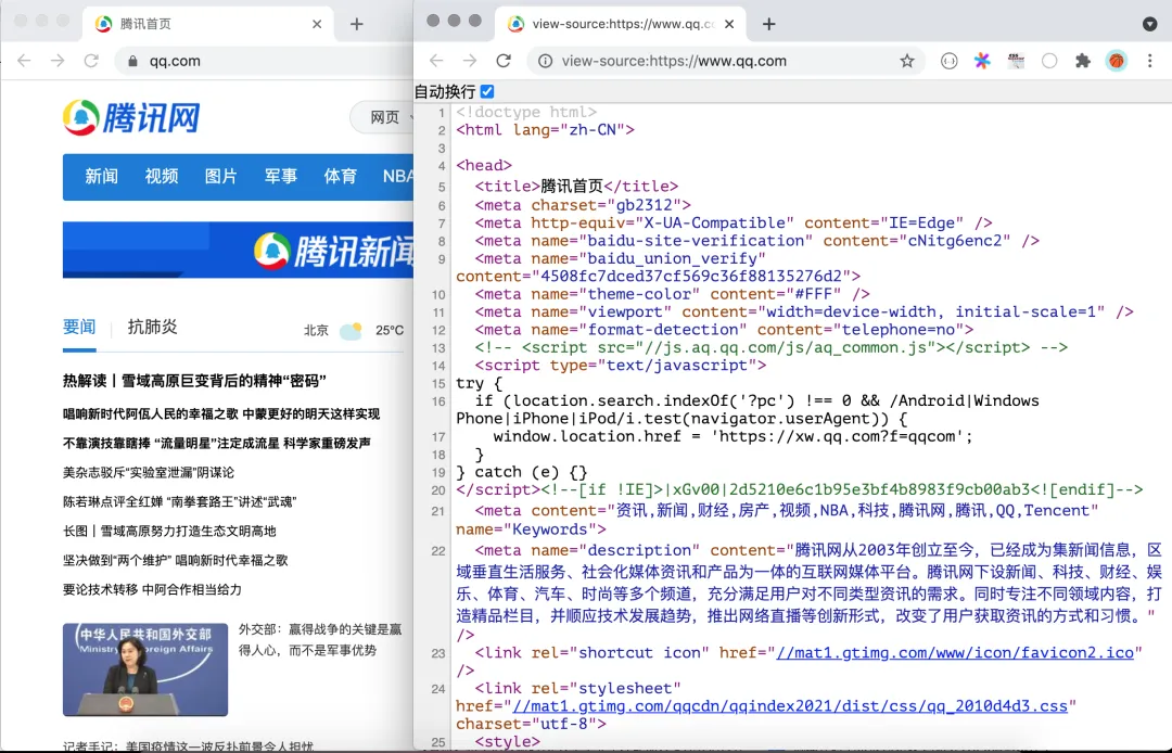 我们在浏览器中打开任意一个网站,通过鼠标右键菜单选择“显示网页源代码”,即可查看该网页对应的HTML代码。