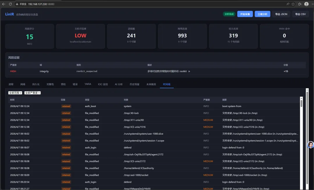 | 文件时间线、持久化 mtime/ctime、wtmp/btmp、auth.log、syslog | 文件时间线、plist mtime、system.log |