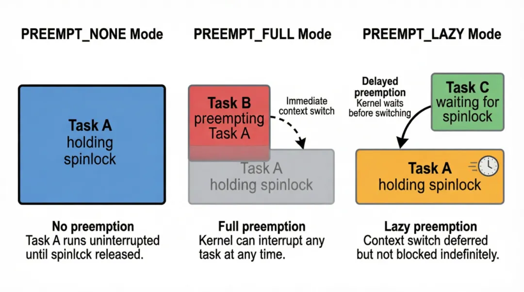 - • PREEMPT_LAZY 比 PREEMPT_NONE 灵活一些,内核会去切换,但会晚一点