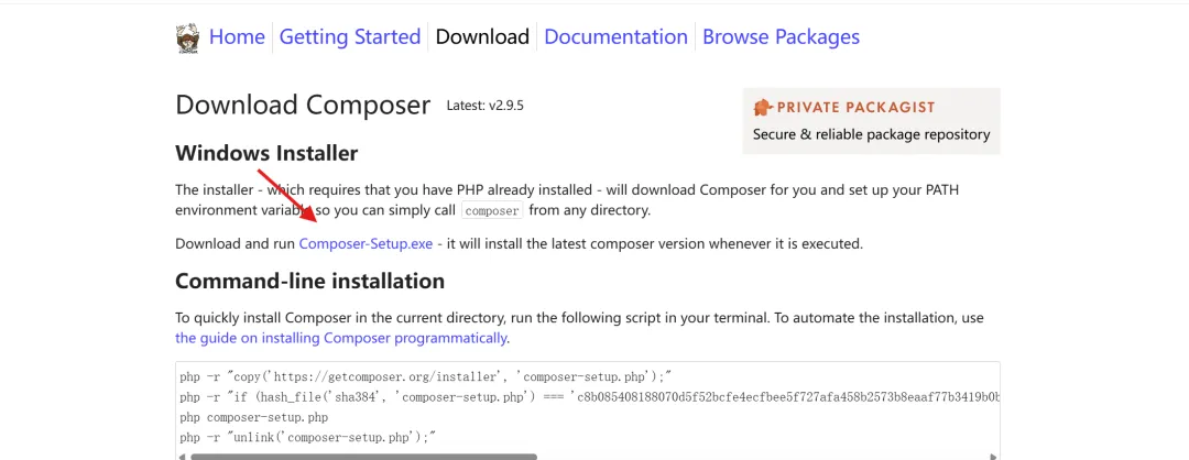 访问composer官网:https://getcomposer.org/download/ 选择下载 Windows 安装程序(Composer-Setup.exe)2.安装 Composer