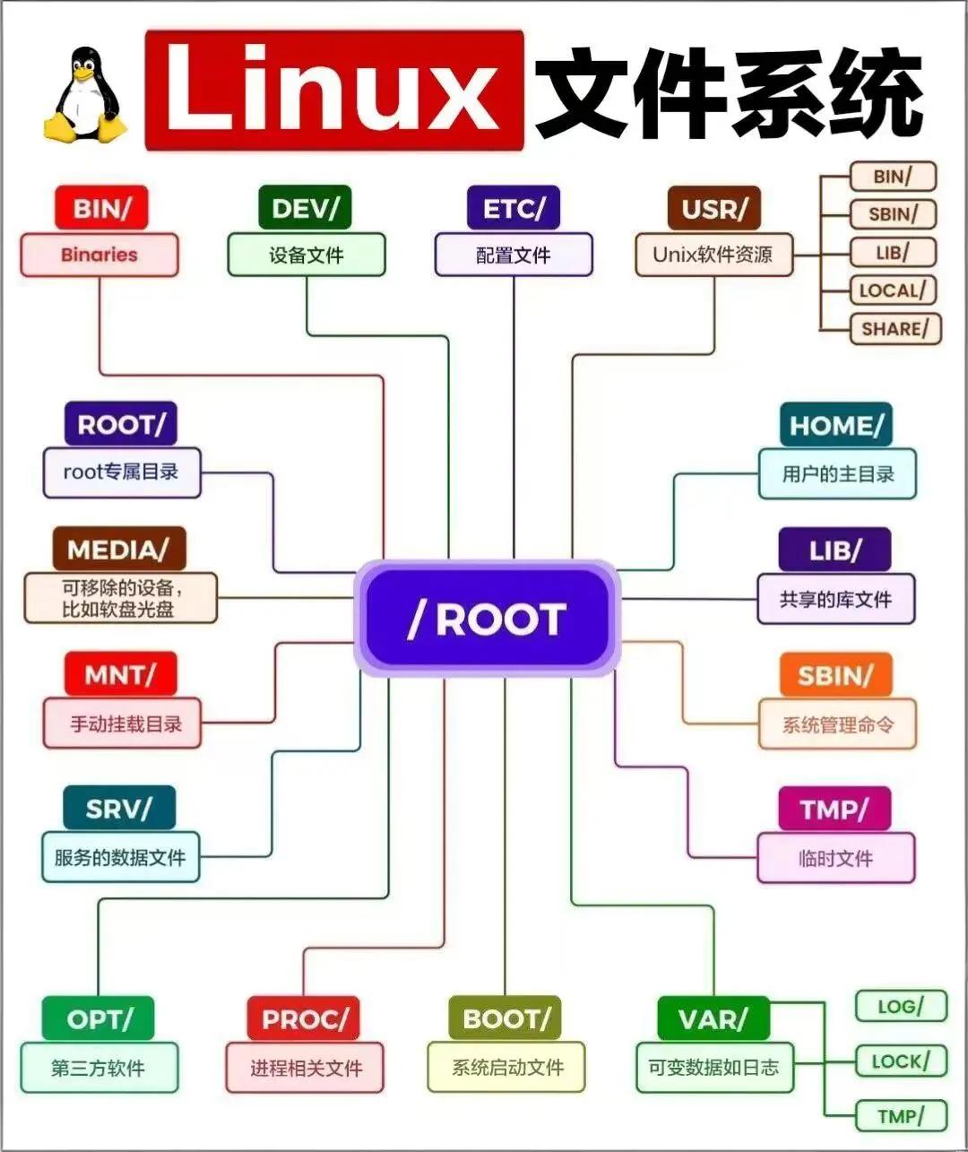 上图总结了linux根目录下各目录的功能,帮助对各个目录的功能更直观的理解,也更容易掌握!