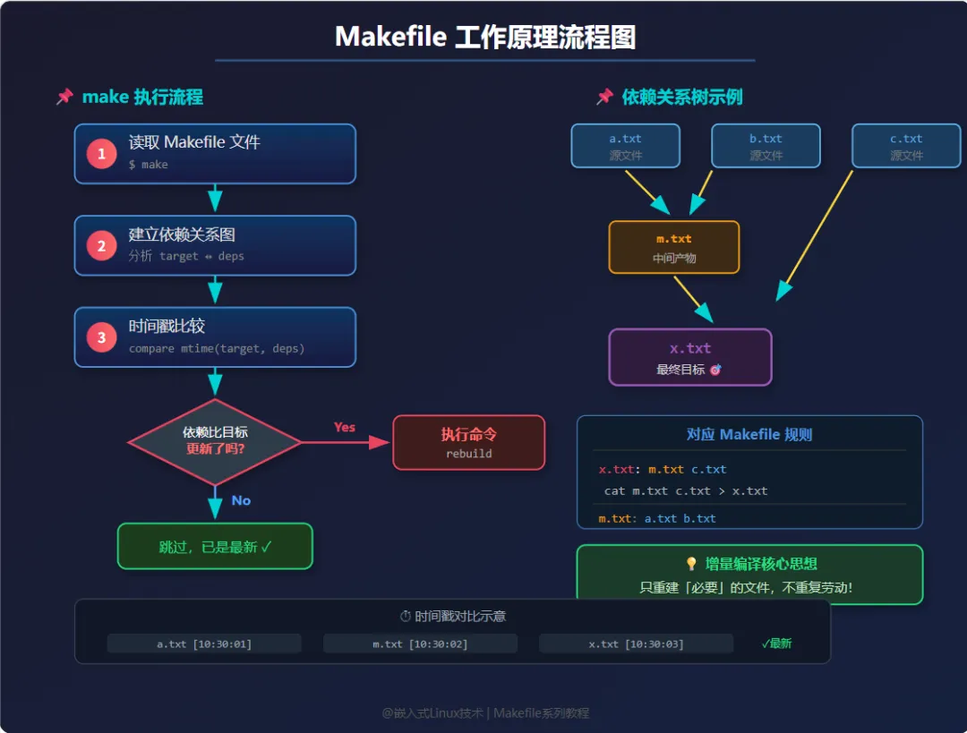 最近停更了一段时间,不知道要更新些什么好,思考了很久,还是慢慢从Linux开始吧,后续再加一些常见的算法。如果让我推荐一个必学工具,Makefile绝对排前三。不管是U-Boot移植、内核编译,还是应用项目构建,都离不开它。今天这篇文章,我把这些年踩过的坑、积累的经验,一次性全盘托出。
