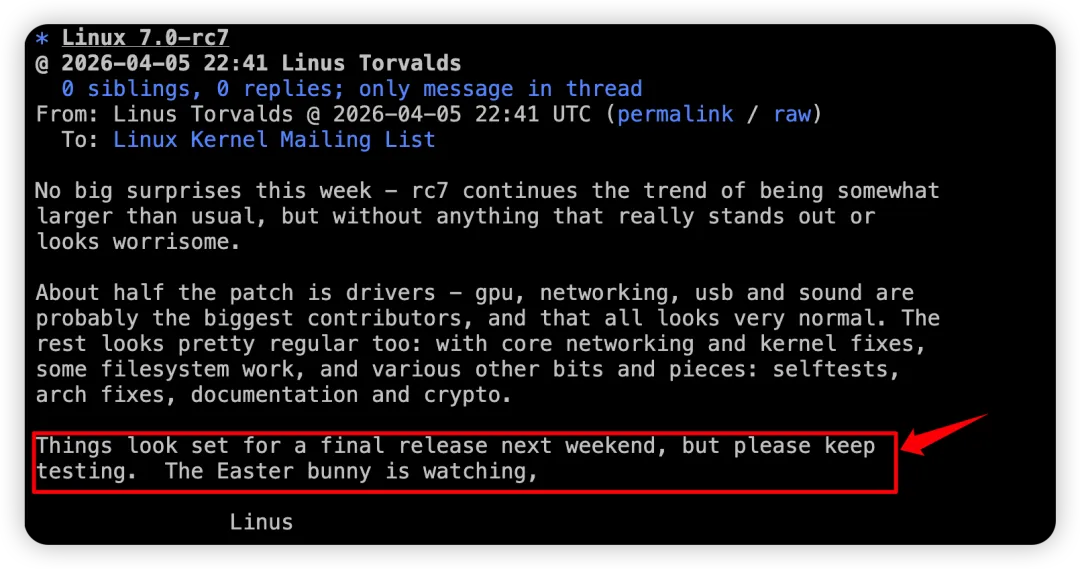 托瓦兹在邮件最后表示,将按计划在下周发布 Linux 7.0 稳定版,同时呼吁测试者在正式版到来前继续进行测试。