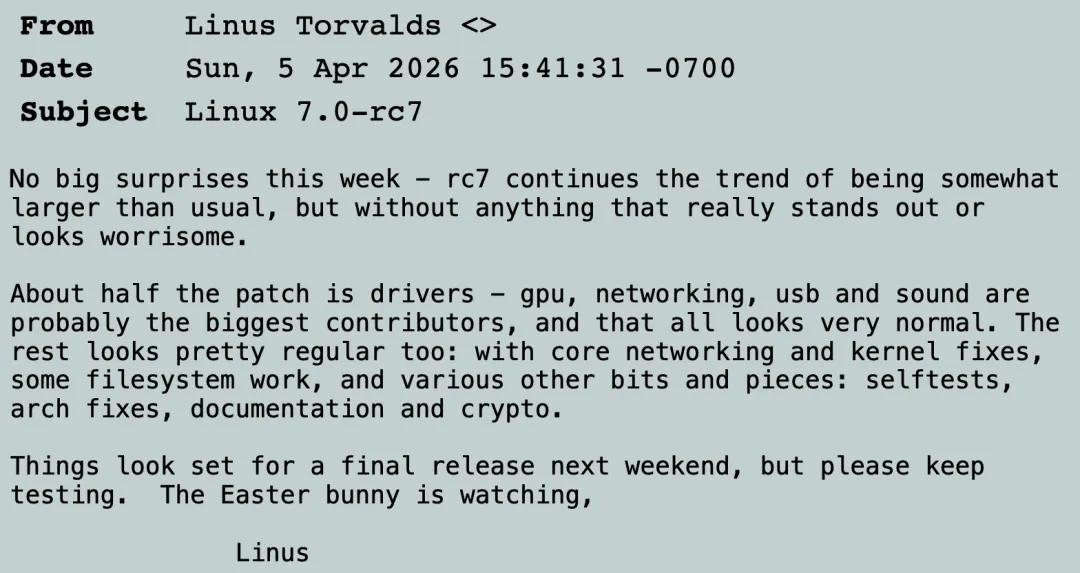 Linux 内核创始人Linus Torvalds 在Linux内核邮件列表(LKML)上宣布,Linux 7.0第七个候选版本(RC7)本周没有出现重大意外情况,这意味着备受期待的Linux 7.0稳定版将按计划在下周正式发布。