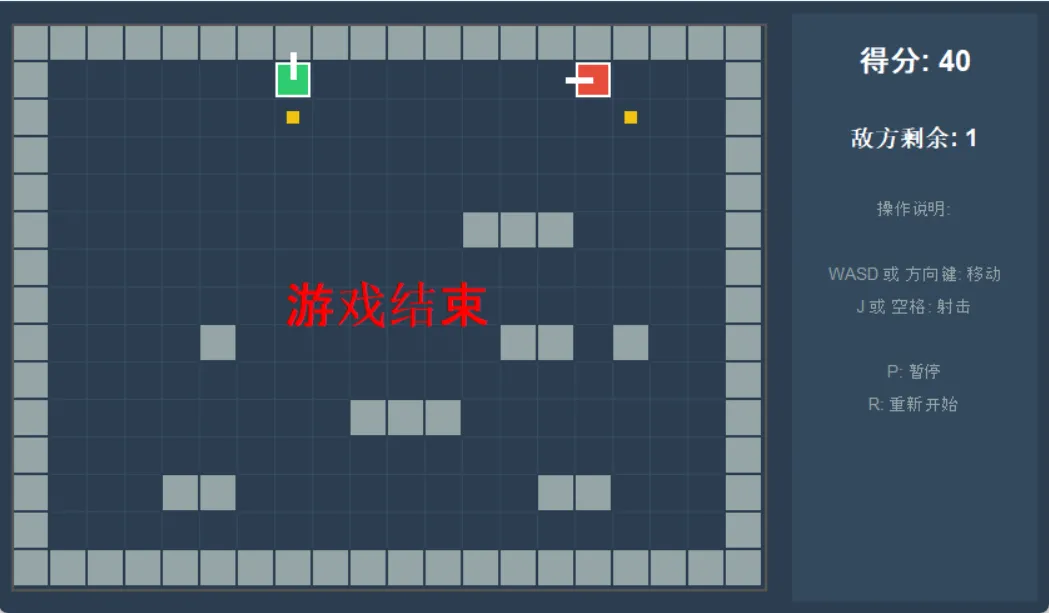 import tkinter as tkimport randomfrom tkinter import messageboxclass TankGame: def __init__(self, root): self.root = root self.root.title("坦克大战") self.root.resizable(False, False) # 游戏配置 self.cell_size = 30 # 每个格子的大小(像素) self.map_width = 20 # 地图宽度(格子数) self.map_height = 15 # 地图高度(格子数) # 计算窗口大小 self.game_width = self.map_width * self.cell_size self.game_height = self.map_height * self.cell_size self.info_width = 200 # 设置窗口大小 self.root.geometry(f"{self.game_width + self.info_width + 40}x{self.game_height + 40}") # 游戏状态 self.player_tank = None self.enemy_tanks = [] self.bullets = [] self.walls = [] self.score = 0 self.enemy_count = 5 # 敌方坦克数量 self.game_over = False self.paused = False self.game_loop_id = None # 移动延迟(防止移动太快) self.move_delay = 0 self.enemy_move_delay = 0 # 颜色配置 self.colors = { 'bg': '#2c3e50', 'player': '#2ecc71', 'enemy': '#e74c3c', 'wall': '#95a5a6', 'bullet': '#f1c40f', 'grid': '#34495e' } # 创建界面 self.setup_ui() # 绑定键盘事件 self.bind_keys() # 开始游戏 self.start_game() # 游戏循环 self.game_loop() def setup_ui(self): """创建用户界面""" # 主框架 main_frame = tk.Frame(self.root, bg=self.colors['bg']) main_frame.pack(expand=True, fill=tk.BOTH) # 游戏画布 self.canvas = tk.Canvas( main_frame, width=self.game_width, height=self.game_height, bg=self.colors['bg'], highlightthickness=2, highlightbackground='#555' ) self.canvas.pack(side=tk.LEFT, padx=10, pady=10) # 信息面板 info_frame = tk.Frame(main_frame, width=self.info_width, bg='#34495e') info_frame.pack(side=tk.RIGHT, padx=10, pady=10, fill=tk.BOTH) info_frame.pack_propagate(False) # 得分显示 self.score_label = tk.Label( info_frame, text=f"得分: {self.score}", font=('Arial', 18, 'bold'), bg='#34495e', fg='white' ) self.score_label.pack(pady=20) # 敌方剩余数量 self.enemy_label = tk.Label( info_frame, text=f"敌方剩余: {self.enemy_count}", font=('Arial', 14, 'bold'), bg='#34495e', fg='white' ) self.enemy_label.pack(pady=10) # 操作说明 controls_frame = tk.Frame(info_frame, bg='#34495e') controls_frame.pack(pady=20) controls = [ "操作说明:", "", "WASD 或 方向键: 移动", "J 或 空格: 射击", "", "P: 暂停", "R: 重新开始" ] for text in controls: label = tk.Label( controls_frame, text=text, font=('Arial', 10), bg='#34495e', fg='#95a5a6' ) label.pack(pady=2) def bind_keys(self): """绑定键盘事件""" # 移动控制 self.root.bind('<KeyPress-Left>', lambda e: self.move_player('left')) self.root.bind('<KeyPress-Right>', lambda e: self.move_player('right')) self.root.bind('<KeyPress-Up>', lambda e: self.move_player('up')) self.root.bind('<KeyPress-Down>', lambda e: self.move_player('down')) self.root.bind('<KeyPress-a>', lambda e: self.move_player('left')) self.root.bind('<KeyPress-d>', lambda e: self.move_player('right')) self.root.bind('<KeyPress-w>', lambda e: self.move_player('up')) self.root.bind('<KeyPress-s>', lambda e: self.move_player('down')) # 射击控制 self.root.bind('<KeyPress-space>', lambda e: self.shoot()) self.root.bind('<KeyPress-j>', lambda e: self.shoot()) self.root.bind('<KeyPress-J>', lambda e: self.shoot()) # 游戏控制 self.root.bind('<KeyPress-p>', lambda e: self.toggle_pause()) self.root.bind('<KeyPress-P>', lambda e: self.toggle_pause()) self.root.bind('<KeyPress-r>', lambda e: self.restart()) self.root.bind('<KeyPress-R>', lambda e: self.restart()) # 确保窗口获得焦点 self.root.focus_set() def start_game(self): """开始游戏""" self.create_map() self.player_tank = Tank(self.map_width // 2, self.map_height - 2, 'player', self.colors['player']) self.enemy_tanks = [] self.bullets = [] self.score = 0 self.enemy_count = 5 self.game_over = False self.paused = False self.move_delay = 0 self.enemy_move_delay = 0 # 创建敌方坦克 for i in range(self.enemy_count): while True: x = random.randint(1, self.map_width - 2) y = random.randint(1, 5) # 确保不与玩家重叠且不与其他敌方坦克重叠 overlap = False if (x, y) == (self.player_tank.x, self.player_tank.y): overlap = True for enemy in self.enemy_tanks: if enemy.x == x and enemy.y == y: overlap = True break if not overlap: enemy = Tank(x, y, 'enemy', self.colors['enemy']) self.enemy_tanks.append(enemy) break self.update_info() self.draw() def create_map(self): """创建地图(墙壁)""" self.walls = [] # 创建边界墙壁 for x in range(self.map_width): self.walls.append(Wall(x, 0)) # 上边界 self.walls.append(Wall(x, self.map_height - 1)) # 下边界 for y in range(self.map_height): self.walls.append(Wall(0, y)) # 左边界 self.walls.append(Wall(self.map_width - 1, y)) # 右边界 # 创建一些障碍物 obstacles = [ (5, 5), (6, 5), (7, 5), (12, 5), (13, 5), (14, 5), (3, 8), (4, 8), (5, 8), (6, 8), (13, 8), (14, 8), (15, 8), (16, 8), (8, 10), (9, 10), (10, 10), (11, 10), (4, 12), (5, 12), (14, 12), (15, 12) ] for x, y in obstacles: if 0 < x < self.map_width - 1 and 0 < y < self.map_height - 1: self.walls.append(Wall(x, y)) def move_player(self, direction): """移动玩家坦克(带延迟,防止移动太快)""" if self.game_over or self.paused: return # 移动延迟控制 if self.move_delay > 0: return new_x, new_y = self.player_tank.x, self.player_tank.y if direction == 'left': new_x -= 1 elif direction == 'right': new_x += 1 elif direction == 'up': new_y -= 1 elif direction == 'down': new_y += 1 # 检查碰撞 if self.can_move(new_x, new_y, self.player_tank): self.player_tank.x = new_x self.player_tank.y = new_y self.player_tank.direction = direction self.move_delay = 3 # 设置移动延迟,数值越大移动越慢 self.draw() def move_enemies(self): """移动敌方坦克(带延迟)""" if self.enemy_move_delay > 0: self.enemy_move_delay -= 1 return for enemy in self.enemy_tanks[:]: # 随机移动 directions = ['up', 'down', 'left', 'right'] move_dir = random.choice(directions) new_x, new_y = enemy.x, enemy.y if move_dir ==