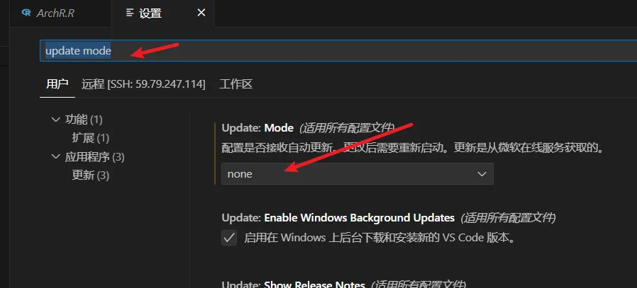 2、安装好后,打开软件,点击左下角设置,在弹出来的搜索框中输入update mode 然后选择none,避免自动更新软件