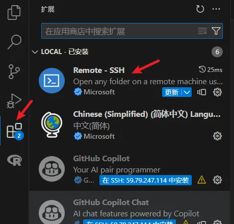 1、安装Remote SSH,在左侧的插件市场(Extensions,快捷键 Ctrl+Shift+X)中搜索并安装插件:Remote - SSH。