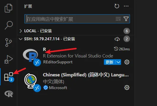 code-server --install-extension REditorSupport.r@2.8.1安装成功后的标志:左侧边栏会出现一个 “R”图标。
