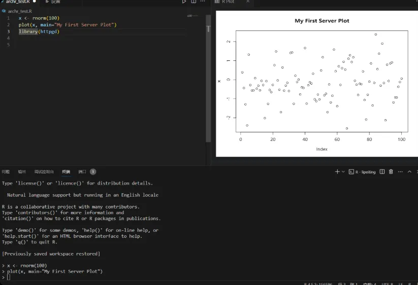 print("Hello, ArchR!")x <- rnorm(100)plot(x, main="My First Server Plot")
