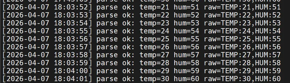 parse ok: temp=25 hum=60 raw=TEMP:25,HUM:60