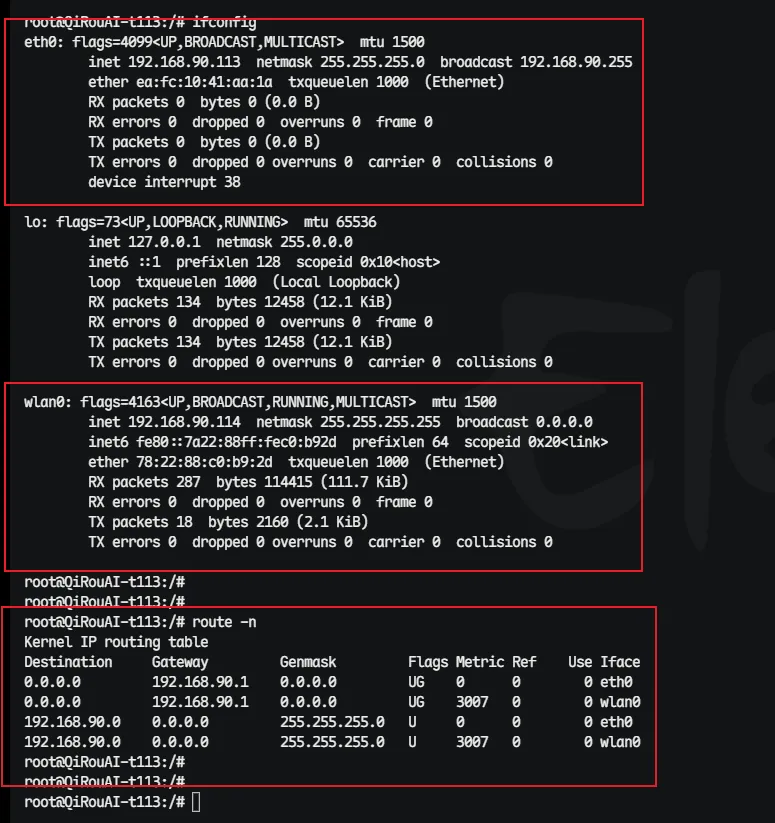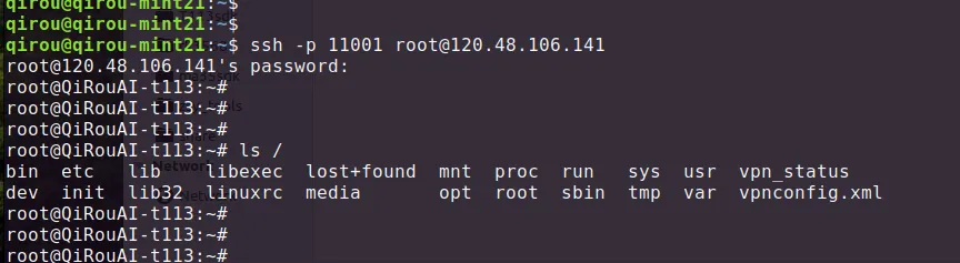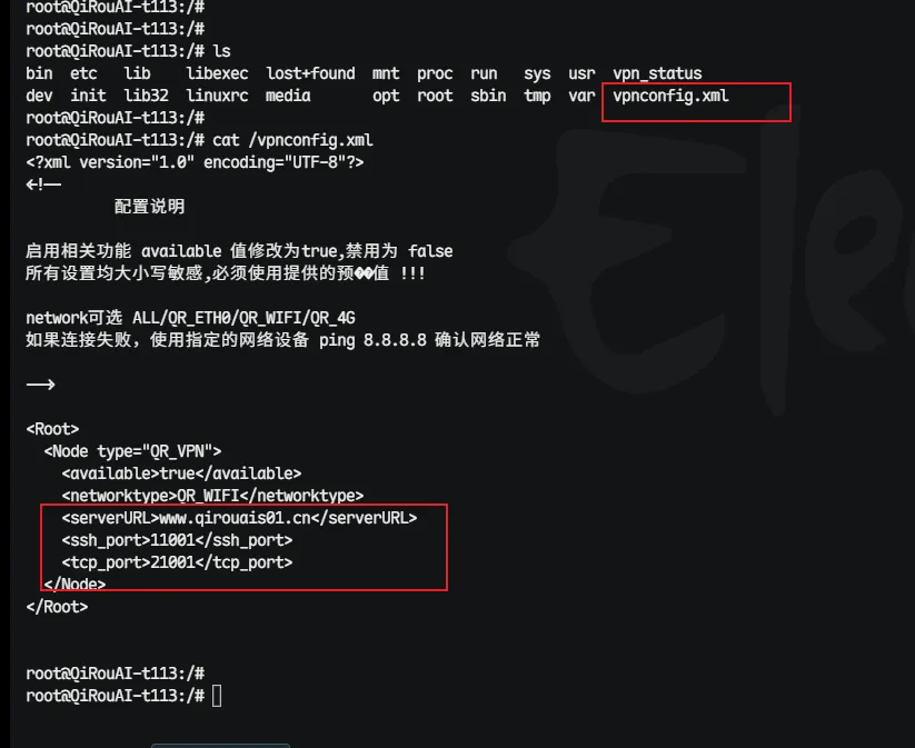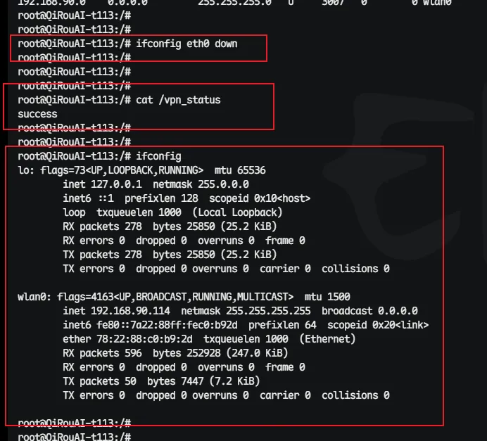 我们的开发板在出售前已经适配好VNC协议配置,通过调试串口读取开发板中VNC的配置信息,即可根据信息进行内网透传SSH登录。开发板支持网口、WiFi、4G三种方式联网,本文演示使用WiFi的方式实现内网透传SSH登陆开发板,并在开发板上进行控制风扇的启停。我们的开发板功能远不止于此,此处仅以控制风扇演示远程登录。您可以免费申请远程测试,联系作者即可为您上电配置一款开发板,让您体验远程登录开发板。 演示硬件介绍。硬件除了开发板以外配备了一个12V转5V和3V输出的电源模块,一个PWM电源模块和一个5V直流电机. 开发板启动后,在根目录下可以查看VNC配置和透传状态。此时我的开发板显示VNC状态是neterror。查看网络和路由状态:可以看出开发板同时使用了网口 eth0 和 wlan0,而且连接在同一个路由器,拥有相同的路由,此时路由默认都会从eth0 进出。详细的解决办法查阅"策略路由"相关知识。此处方便测试,禁用eth0(ifconfig eth0 down).此时我们就可以打开支持SSH协议的软件来连接开发板。通过 <serverURL>www.qirouais01.cn</serverURL> 可以获取用于SSH登录的IP地址。<ssh_port>11001</ssh_port> 用于SSH登录的端口<tcp_port>21001</tcp_port> 用于TCP通信开发的端口 获取IP : 120.48.106.141 后,结合 11001 端口进行 SSH 登录 ssh -p 11001 root@120.48.106.141 密码 rootssh -p 11001 user@120.48.106.141 密码 user登录后便进入到开发板系统中,此时操作一个远在他乡的开发板就像操作自己实验室的开发板一样。开发板连接的风扇使用 GPIO 144控制,在开发板中使用如下步骤即可控制风扇启停远程登录只是我们开发板的入门篇,我们的开发板还能够实现有线、WiFi、4G数据互传,串口/网络数据透传互转,本地SQLite数据存储等功能。如果您想体验一下远程操作开发,请联系作者,我们免费提供远程测试,还免费提供SDK开发包,让您体验远程开发部署。
