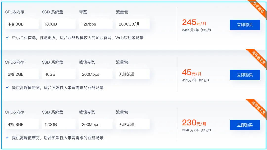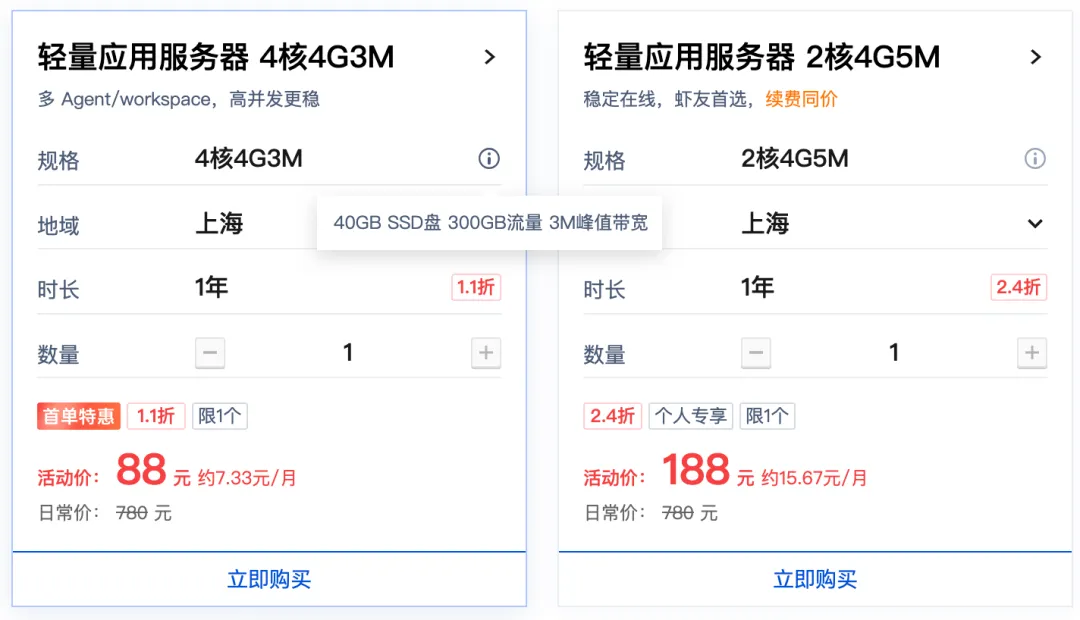 国内云主机的价格第一年的费用比较便宜,可以用来练练手。用熟练后再到国外平台试试。国内的云主机流量更贵,只有3M的带宽,每月限额200G-300G流量。阿里的和腾讯的入门云主机我都用过,主要用途是搭建中转站,比如搞个远程桌面、p2p组网。更多的是用它的公网IP,毕竟这玩意也属于稀缺资源。然后就是备案,有10来块钱的便宜域名可以申请,不备案只能用IP访问,备案后可以绑定域名。需要注意的是国内的云主机不能用来搭梯子,限制比较多。国外的比较随意,不需要备案,流量也给的足,每月给1000G的流量。流量就是钱,云主机厂商也是拿真金白银去运营商那里买流量的。大家平时用的抖音短视频,每天要耗费大量的流量。抖音每年要给当地的运营商非常非常多的钱,用途就是买流量。大家平时上网好像感觉流量好像不用花钱,但对应到服务器资源是非常贵的。除非你直接建机房,拉互联网企业专线。100M的一根的电信专线,大概要2.5万每年。一根1000M的电信专线,一年要10万。这种不计流量,按带宽卖钱。而入门的云服务器,3M带宽起步,最大15M的带宽。如果是企业用,有多种套餐可选,平均每个月从几十到几百块钱。看到中间那款,让我想起 coding plan 了,每月¥40。云主机还是停好玩的,可以查看我以前的云主机的文章。