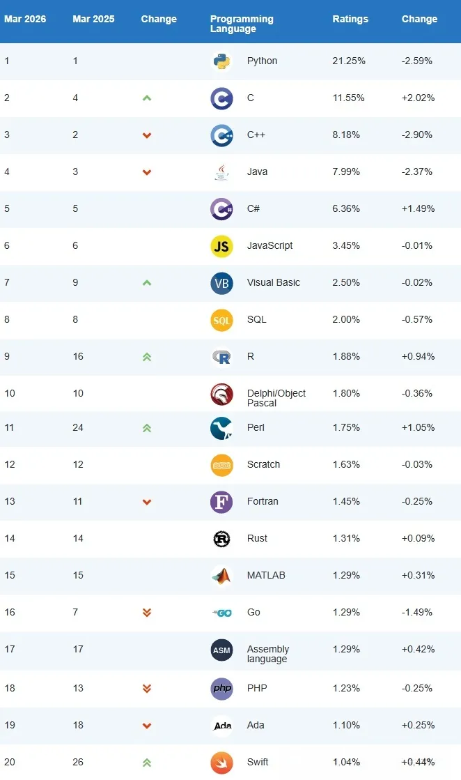 TIOBE 3 月榜单释放一个强烈信号:AI 时代,不是 Python 的终点,而是它的主场,21.25% 的份额,第二名 C 语言,不到它的一半!