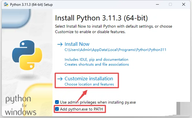 3、勾选Add python...,然后点customize....