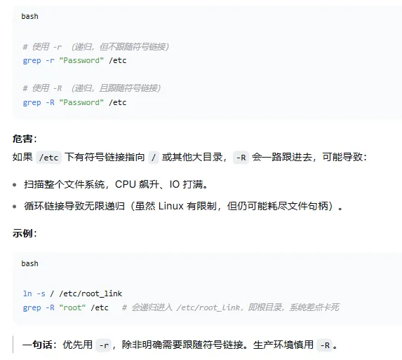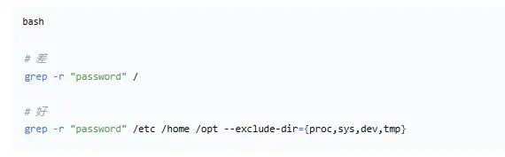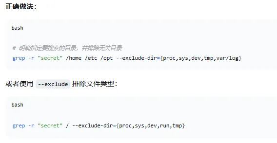 3.尽量避免在根目录 / 下直接使用 grep -r,在指定具体的子目录进行搜索。总结