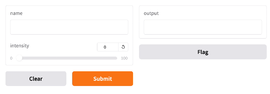 import gradio as grdefgreet(name, intensity):return"Hello, "+ name +"!"*int(intensity)demo = gr.Interface( fn=greet, inputs=["text","slider"], outputs=["text"],)demo.launch()