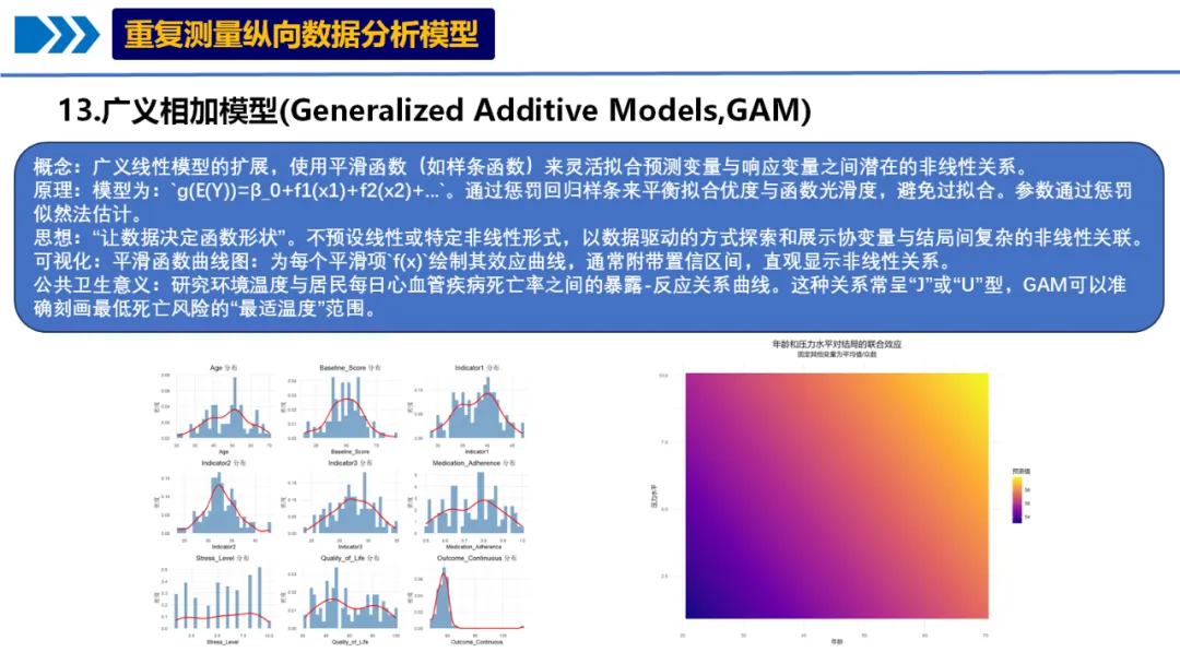 # pip install numpy pandas matplotlib seaborn scipy statsmodels scikit-learn pygam pingouin plotly openpyxl# ===========================================# 13. 广义相加模型 (Generalized Additive Models, GAM) - Python实现# ===========================================import osimport sysimport numpy as npimport pandas as pdimport warningswarnings.filterwarnings('ignore')# 设置路径 - 自动寻找桌面路径import platformif platform.system() == "Windows": desktop_path = os.path.join(os.path.expanduser("~"), "Desktop")else: desktop_path = os.path.join(os.path.expanduser("~"), "Desktop")# 创建结果文件夹output_dir = os.path.join(desktop_path, "13-GAM结果")os.makedirs(output_dir, exist_ok=True)os.chdir(output_dir)print(f"工作目录设置为: {output_dir}")# 1. 加载必要的包print("正在加载必要的Python包...")try: import numpy as np import pandas as pd import matplotlib.pyplot as plt import seaborn as sns from scipy import stats import statsmodels.api as sm from sklearn.model_selection import KFold from sklearn.metrics import mean_squared_error, r2_score, accuracy_score, roc_auc_score from pygam import LinearGAM, s, f, te, PoissonGAM, LogisticGAM from scipy.stats import norm from sklearn.preprocessing import LabelEncoder import pickle from datetime import datetimeprint("所有必要的包加载成功!")except ImportError as e:print(f"缺少必要的包: {e}")print("请使用以下命令安装: pip install numpy pandas matplotlib seaborn scipy statsmodels scikit-learn pygam") sys.exit(1)# 设置中文显示plt.rcParams['font.sans-serif'] = ['SimHei', 'Arial Unicode MS', 'DejaVu Sans']plt.rcParams['axes.unicode_minus'] = False# 设置绘图风格sns.set_style("whitegrid")plt.style.use('seaborn-v0_8-whitegrid')# 2. 读取数据print("\n正在读取数据...")# 读取Excel文件try: excel_path = os.path.join(desktop_path, "longitudinal_data.xlsx") data_full = pd.read_excel(excel_path, sheet_name='Full_Dataset') data_simple = pd.read_excel(excel_path, sheet_name='Simple_Dataset')print(f"数据读取成功!")print(f"Full Dataset: {data_full.shape[0]} 行, {data_full.shape[1]} 列")print(f"Simple Dataset: {data_simple.shape[0]} 行, {data_simple.shape[1]} 列")except FileNotFoundError:print(f"错误: 未找到文件 {excel_path}")print("正在创建示例数据用于演示...")# 创建示例数据 np.random.seed(123) n_samples = 500# 创建模拟数据 data_full = pd.DataFrame({'ID': range(1, n_samples + 1),'Time': np.random.choice([0, 1, 2], n_samples),'Age': np.random.normal(50, 15, n_samples).clip(20, 80),'Sex': np.random.choice(['M', 'F'], n_samples),'Treatment': np.random.choice(['A', 'B', 'C'], n_samples),'Baseline_Score': np.random.normal(50, 10, n_samples),'Indicator1': np.random.normal(0, 1, n_samples),'Indicator2': np.random.normal(0, 1, n_samples),'Indicator3': np.random.normal(0, 1, n_samples),'Medication_Adherence': np.random.uniform(0, 1, n_samples),'Stress_Level': np.random.uniform(1, 10, n_samples),'Quality_of_Life': np.random.uniform(20, 100, n_samples),'Outcome_Continuous': np.random.normal(50, 15, n_samples),'Outcome_Binary': np.random.binomial(1, 0.3, n_samples),'Outcome_Count': np.random.poisson(3, n_samples),'SES': np.random.choice(['Low', 'Medium', 'High'], n_samples),'Genetic_Marker': np.random.choice(['G1', 'G2', 'G3'], n_samples) }) data_simple = data_full.copy()print("示例数据创建完成!")# 3. 数据预处理print("\n正在进行数据预处理...")# 选择基线数据(Time=0)进行分析baseline_data = data_full[data_full['Time'] == 0].drop_duplicates(subset=['ID'])# 创建GAM分析数据集gam_data = baseline_data[['ID', 'Age', 'Sex', 'Treatment', 'Baseline_Score','Indicator1', 'Indicator2', 'Indicator3','Medication_Adherence', 'Stress_Level', 'Quality_of_Life','Outcome_Continuous', 'Outcome_Binary', 'Outcome_Count','SES', 'Genetic_Marker']].copy()# 转换因子变量gam_data['Sex'] = pd.Categorical(gam_data['Sex'])gam_data['Treatment'] = pd.Categorical(gam_data['Treatment'])gam_data['SES'] = pd.Categorical(gam_data['SES'], categories=['Low', 'Medium', 'High'], ordered=True)gam_data['Genetic_Marker'] = pd.Categorical(gam_data['Genetic_Marker'])# 创建衍生变量gam_data['Age_Group'] = pd.cut(gam_data['Age'], bins=[20, 40, 60, 80], labels=['20-40', '41-60', '61-80'])gam_data['Stress_Category'] = pd.cut(gam_data['Stress_Level'], bins=[0, 3, 7, 10], labels=['Low', 'Medium', 'High'])# 处理缺失值 - 用中位数填充数值变量numeric_cols = gam_data.select_dtypes(include=[np.number]).columnsfor col in numeric_cols:if gam_data[col].isnull().any(): median_val = gam_data[col].median() gam_data[col] = gam_data[col].fillna(median_val)print(f" 用中位数填充 {col} 的缺失值: {median_val:.2f}")# 显示数据结构print("\nGAM分析数据结构:")print(gam_data.info())print(f"\n数据集形状: {gam_data.shape}")# 检查缺失值print("\n缺失值统计:")missing_stats = gam_data.isnull().sum()if missing_stats.sum() > 0:print(missing_stats[missing_stats > 0])else:print("无缺失值")# 4. 数据探索性分析print("\n进行数据探索性分析...")# 4.1 连续变量的分布continuous_vars = ["Age", "Baseline_Score", "Indicator1", "Indicator2","Indicator3", "Medication_Adherence", "Stress_Level","Quality_of_Life", "Outcome_Continuous"]# 创建分布图fig, axes = plt.subplots(3, 3, figsize=(16, 12))axes = axes.flatten()for i, var in enumerate(continuous_vars):if i < len(axes): ax = axes[i]# 直方图 ax.hist(gam_data[var].dropna(), bins=30, density=True, alpha=0.7, color='steelblue', edgecolor='black')# 密度曲线 from scipy.stats import gaussian_kde data = gam_data[var].dropna()if len(data) > 1: kde = gaussian_kde(data) x_range = np.linspace(data.min(), data.max(), 100) ax.plot(x_range, kde(x_range), color='red', linewidth=2) ax.set_title(f"{var} 分布", fontsize=12) ax.set_xlabel(var) ax.set_ylabel("密度") ax.grid(True, alpha=0.3)# 调整布局并保存plt.tight_layout()plt.savefig("Variable_Distributions.png", dpi=300, bbox_