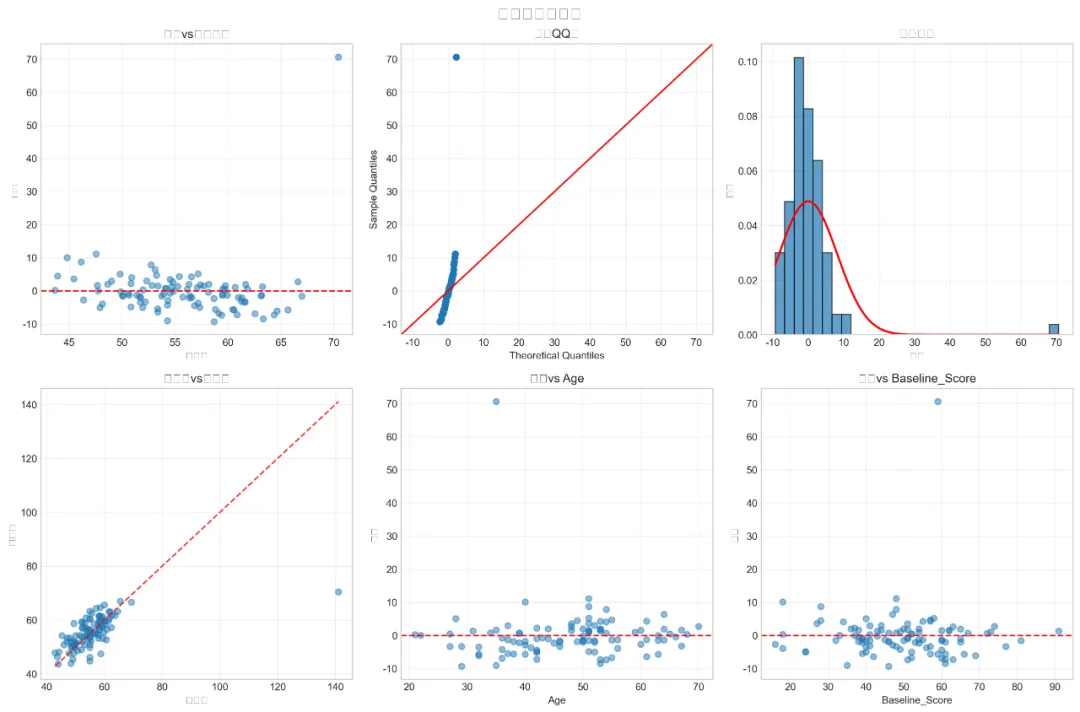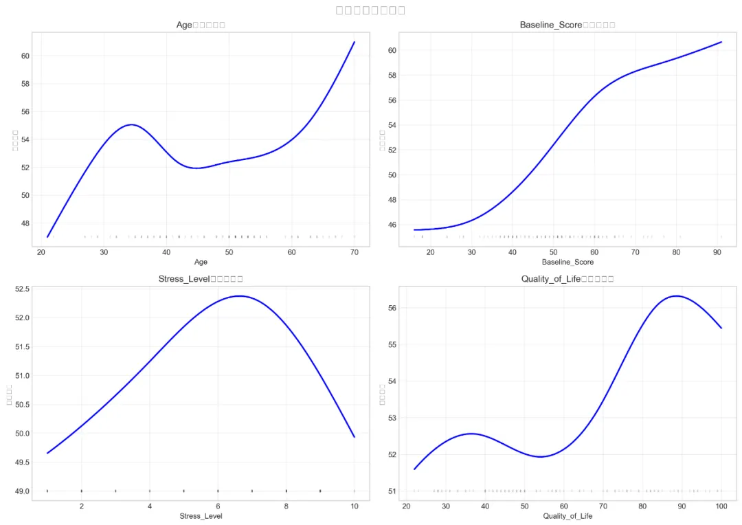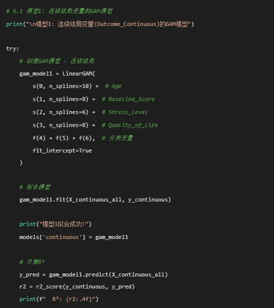 # 计算AIC和BIC n = len(y_continuous) residuals = y_continuous - y_pred rss = np.sum(residuals ** 2) k = X_continuous_all.shape[1] + 1 # 参数数量(包括截距)# AIC aic = n * np.log(rss / n) + 2 * kprint(f" AIC: {aic:.2f}")# BIC bic = n * np.log(rss / n) + k * np.log(n)print(f" BIC: {bic:.2f}")except Exception as e:print(f"模型1拟合失败: {e}") models['continuous'] = None# 6.2 模型2: 二分类结局变量的GAM模型print("\n检查Outcome_Binary的分布:")print(gam_data['Outcome_Binary'].value_counts())# 如果变异不足,跳过二分类模型if len(gam_data['Outcome_Binary'].unique()) > 1:print("\n模型2: 二分类结局变量(Outcome_Binary)的GAM模型") try:# 创建逻辑GAM模型 gam_model2 = LogisticGAM( s(0, n_splines=8) + # Age s(1, n_splines=6) + # Baseline_Score s(2, n_splines=5) + # Stress_Level f(3) + f(4), # Sex和Treatment fit_intercept=True )# 拟合模型 gam_model2.fit(X_binary, y_binary)print("模型2拟合成功!") models['binary'] = gam_model2# 计算准确率 y_pred_proba = gam_model2.predict_proba(X_binary) y_pred = (y_pred_proba >= 0.5).astype(int) accuracy = accuracy_score(y_binary, y_pred)print(f" 训练集准确率: {accuracy * 100:.2f}%") except Exception as e:print(f"模型2拟合失败: {e}") models['binary'] = Noneelse:print("\nOutcome_Binary没有足够变异,跳过二分类GAM模型") models['binary'] = None# 6.3 模型3: 计数结局变量的GAM模型print("\n模型3: 计数结局变量(Outcome_Count)的GAM模型")try:# 创建Poisson GAM模型 gam_model3 = PoissonGAM( s(0, n_splines=10) + # Age s(1, n_splines=8) + # Baseline_Score s(2, n_splines=8) + # Quality_of_Life f(3) + f(4) + f(5), # 分类变量 fit_intercept=True )# 拟合模型 gam_model3.fit(X_count, y_count)print("模型3拟合成功!") models['count'] = gam_model3# 计算预测值 y_pred_count = gam_model3.predict(X_count)# 计算RMSE rmse = np.sqrt(mean_squared_error(y_count, y_pred_count))print(f" RMSE: {rmse:.4f}")except Exception as e:print(f"模型3拟合失败: {e}") models['count'] = None# 7. 模型诊断和评估print("\n进行模型诊断和评估...")# 7.1 提取和保存拟合指标print("\n提取模型拟合指标...")def extract_model_stats(model, model_name, X, y, model_type):"""提取GAM模型的统计指标"""if model is None:return {'Model': model_name,'Type': model_type,'AIC': np.nan,'BIC': np.nan,'R_squared': np.nan,'RMSE': np.nan,'Accuracy': np.nan,'AUC': np.nan,'n': len(y) if y is not None else np.nan,'n_params': np.nan } stats_dict = {'Model': model_name,'Type': model_type,'n': len(y) }# 计算预测值 y_pred = model.predict(X)# 对于连续模型if model_type == 'continuous':# 计算R² r2 = r2_score(y, y_pred) stats_dict['R_squared'] = round(r2, 4)# 计算RMSE rmse = np.sqrt(mean_squared_error(y, y_pred)) stats_dict['RMSE'] = round(rmse, 4)# 计算AIC和BIC residuals = y - y_pred rss = np.sum(residuals ** 2) n = len(y)# 估计参数数量# 注意:这是一个简化估计,实际GAM的参数数量更复杂 n_params = X.shape[1] + 1 # 特征数 + 截距 aic = n * np.log(rss / n) + 2 * n_params bic = n * np.log(rss / n) + n_params * np.log(n) stats_dict['AIC'] = round(aic, 2) stats_dict['BIC'] = round(bic, 2) stats_dict['n_params'] = n_params stats_dict['Accuracy'] = np.nan stats_dict['AUC'] = np.nan# 对于二分类模型elif model_type == 'binary':# 计算准确率 y_pred_proba = model.predict_proba(X) y_pred_class = (y_pred_proba >= 0.5).astype(int) accuracy = accuracy_score(y, y_pred_class) stats_dict['Accuracy'] = round(accuracy, 4)# 计算AUC try: auc = roc_auc_score(y, y_pred_proba) stats_dict['AUC'] = round(auc, 4) except: stats_dict['AUC'] = np.nan# 对于分类模型,我们简化AIC/BIC计算 stats_dict['AIC'] = np.nan stats_dict['BIC'] = np.nan stats_dict['R_squared'] = np.nan stats_dict['RMSE'] = np.nan stats_dict['n_params'] = np.nan# 对于计数模型elif model_type == 'count':# 计算RMSE rmse = np.sqrt(mean_squared_error(y, y_pred)) stats_dict['RMSE'] = round(rmse, 4) stats_dict['AIC'] = np.nan stats_dict['BIC'] = np.nan stats_dict['R_squared'] = np.nan stats_dict['Accuracy'] = np.nan stats_dict['AUC'] = np.nan stats_dict['n_params'] = np.nanreturn stats_dict# 提取所有模型的统计指标model_stats = pd.DataFrame([ extract_model_stats(models.get('continuous'), "连续结局模型", X_continuous_all, y_continuous, 'continuous'), extract_model_stats(models.get('binary'), "二分类结局模型", X_binary, y_binary, 'binary'), extract_model_stats(models.get('count'), "计数结局模型", X_count, y_count, 'count')])print("\n模型统计量:")print(model_stats)# 保存统计指标model_stats.to_csv("GAM_Model_Statistics.csv", index=False, encoding='utf-8-sig')print("\n模型统计量已保存: GAM_Model_Statistics.csv")# 8. 模型可视化print("\n生成模型可视化图形...")# 8.1 模型诊断图 - 仅对连续模型if models.get('continuous') is not None:print("\n生成连续模型诊断图...") try: gam_model1 = models['continuous']# 创建诊断图 fig, axes = plt.subplots(2, 3, figsize=(15, 10)) axes = axes.flatten()# 获取预测值和残差 y_pred = gam_model1.predict(X_continuous_all) residuals = y_continuous - y_pred# 1. 残差vs拟合值图 axes[0].scatter(y_pred, residuals, alpha=0.5) axes[0].axhline(y=0, color='r', linestyle='--') axes[0].set_xlabel('拟合值') axes[0].set_ylabel('残差') axes[0].set_title('残差vs拟合值图') axes[0].grid(True, alpha=0.3)# 2. QQ图 sm.qqplot(residuals, line='45', ax=axes[1]) axes[1].set_title('残差QQ图') axes[1].grid(True, alpha=0.3)# 3. 残差直方图 axes[2].hist(residuals, bins=30, density=True, alpha=0.7, edgecolor='black') x = np.linspace(residuals.min(), residuals.max(), 100) axes[2].plot(x, norm.pdf(x, residuals.mean(), residuals.std()), 'r-', linewidth=2) axes[2].set_xlabel('残差') axes[2].set_ylabel('密度') axes[2].set_title('残差分布') axes[2].grid(True, alpha=0.3)# 4. 观测值vs预测值 axes[3].scatter(y_continuous, y_pred, alpha=0.5) min_val = min(y_continuo