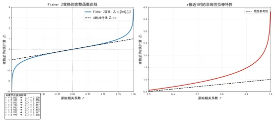 三是在区间内,变换曲线与线性参考线几乎重合,说明在中等及以下强度的相关系数区间内,Fisher Z变换的非线性效应很弱,变换前后的数值差异很小。