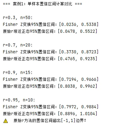 当总体相关系数接近时,无论样本量大小,都必须使用Fisher Z变换,因为原始的正态近似会完全失效,出现边界越界的问题,只有Fisher Z变换能构建合理的置信区间。