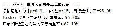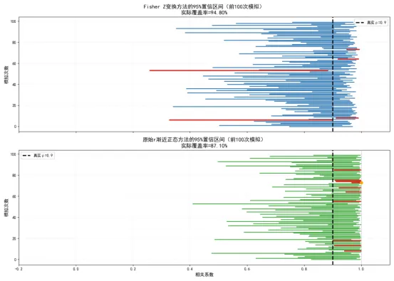 一是在二元正态分布下,置信区间的实际覆盖率与目标95%几乎完全一致,验证了我们之前的结论,Fisher Z变换在正态总体下具有极高的精度。