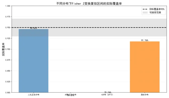 稳健性与适用边界:Fisher Z变换在二元正态分布下表现完美,对轻度非正态分布具有一定的耐受性,但在严重厚尾、混合分布等极端非正态场景下,稳健性会严重下降,置信区间覆盖率不足,统计推断结果会出现系统性偏差。