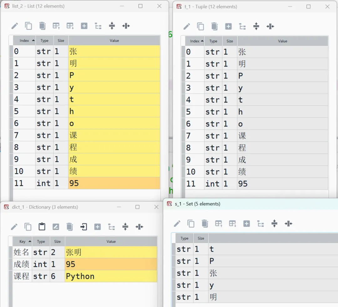list_2=['张','明','P','y','t','h','o','课','程','成','绩',95] #列表t_1=('张','明','P','y','t','h','o','课','程','成','绩',95) #元组dict_1={'姓名':'张明','课程':'Python','成绩':95} #字典s_1={'张','明','P','y','t','t'} #集合