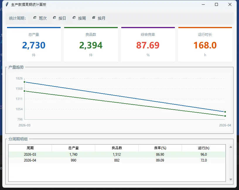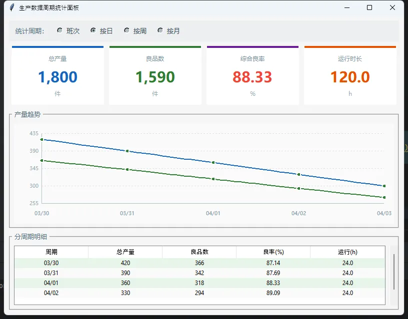 周期统计界面,说白了就是:按时间维度(班次/日/周/月)聚合生产数据,用图表和表格同时呈现,让管理人员一眼看清楚产线状态。需求不复杂,但实现起来有几个绕不开的坑——数据聚合逻辑怎么写才不乱、Tkinter的Canvas图表性能够不够用、多周期切换时界面怎么刷新不闪烁。这篇文章把这些问题一次说清楚。