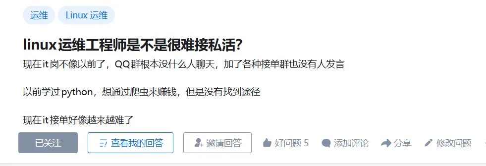 最近有个做了五年Linux运维的朋友跟我吐槽,看着前端、后端同学靠接私活轻松赚钱,自己却连个像样的私活都接不到,无奈问我:"咱们运维是不是天生就不适合搞副业?"