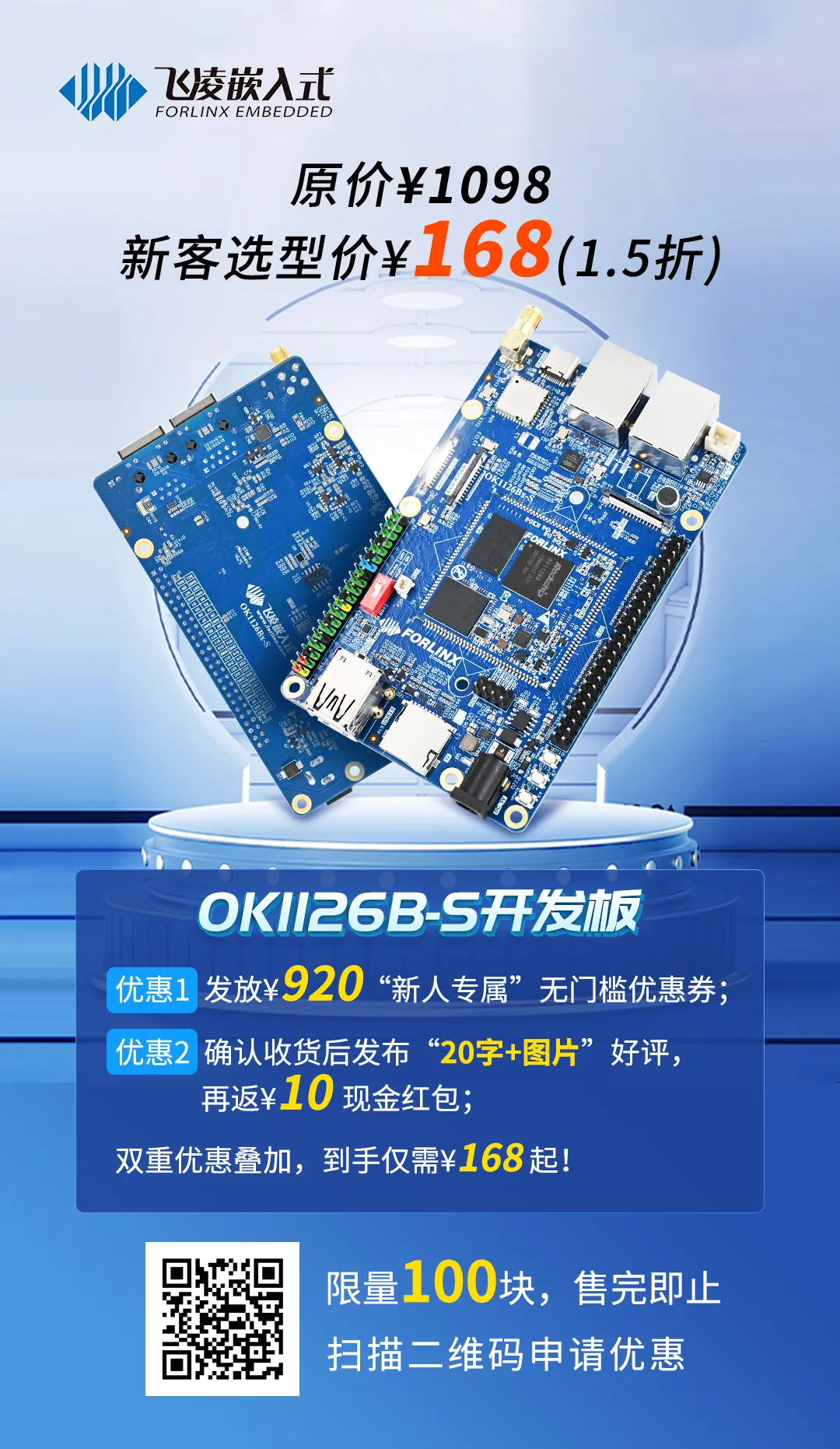 现在,飞凌嵌入式面向全新企业客户推出OK1126B-S开发板专属优惠活动——【新客优惠券】与【好评返现】双重优惠叠加,到手仅需168元起。