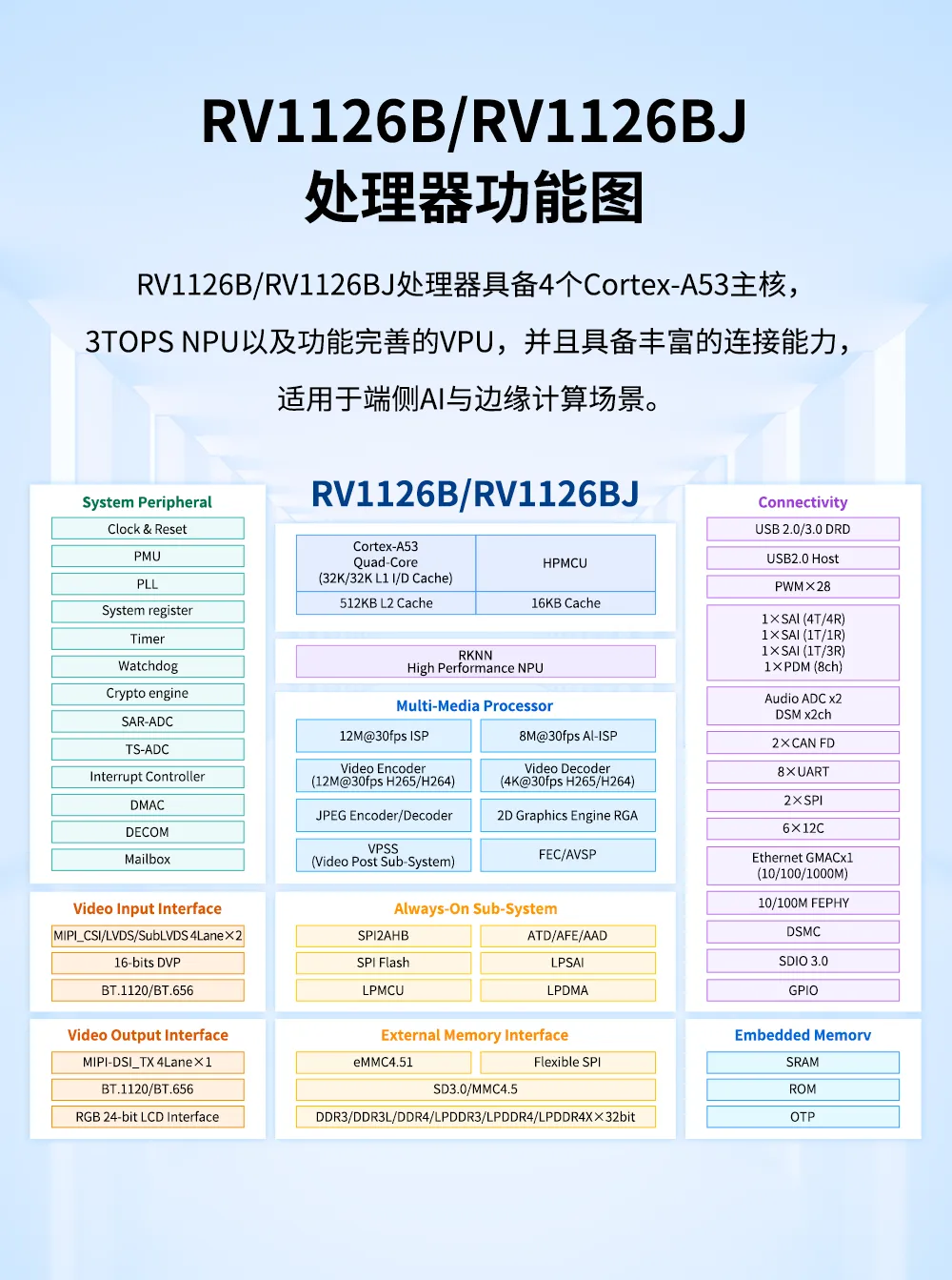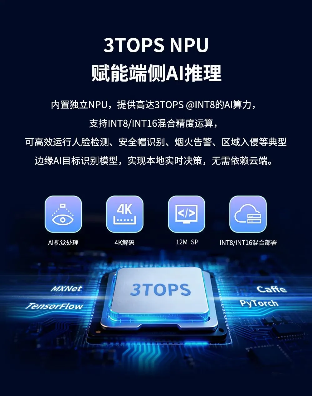 更省心的是,它单芯片就集成了CPU、NPU、AI-ISP和编解码,性能在线、功耗更低,整体性价比也更适合批量落地。
