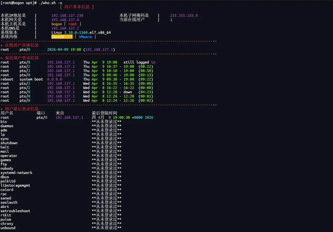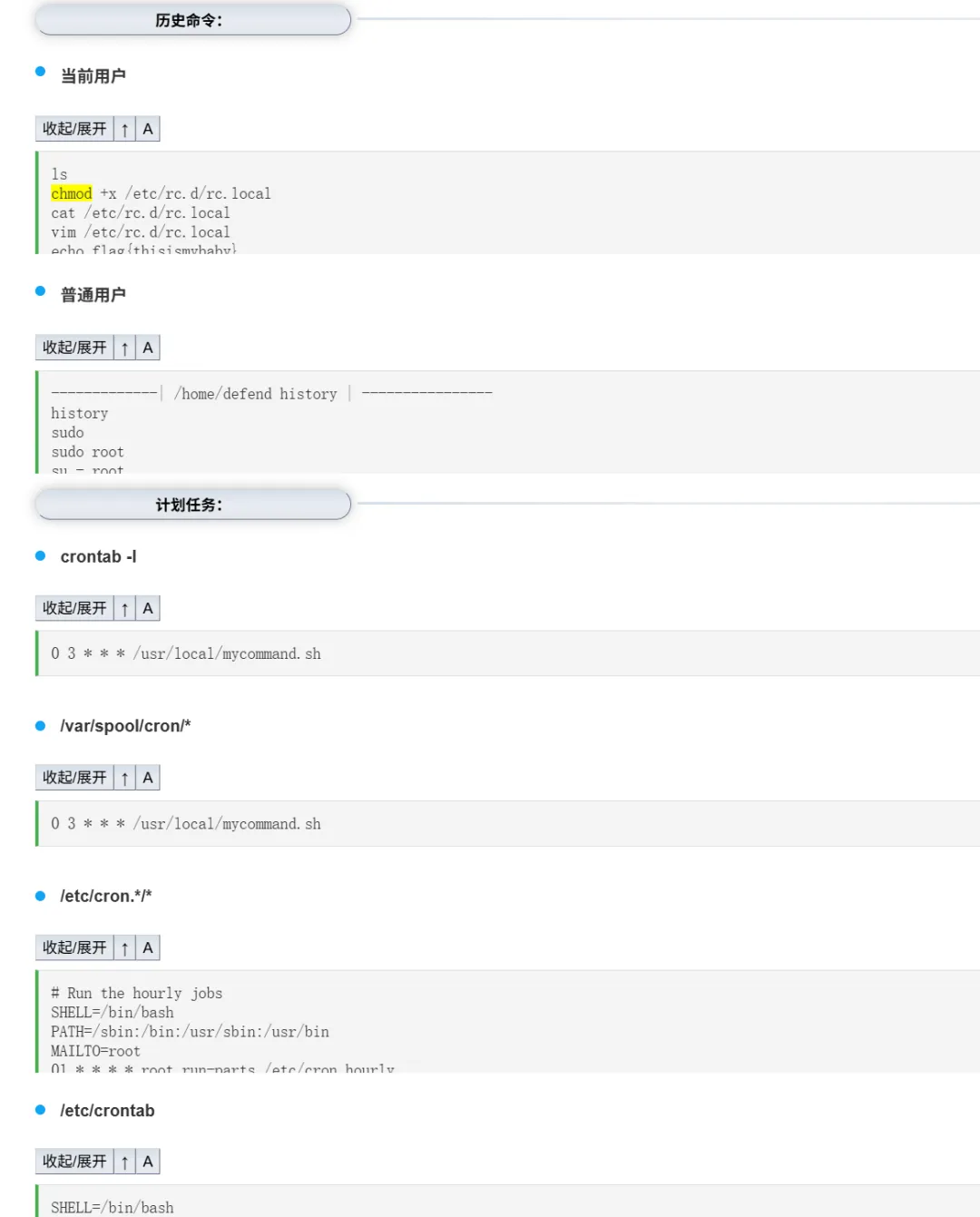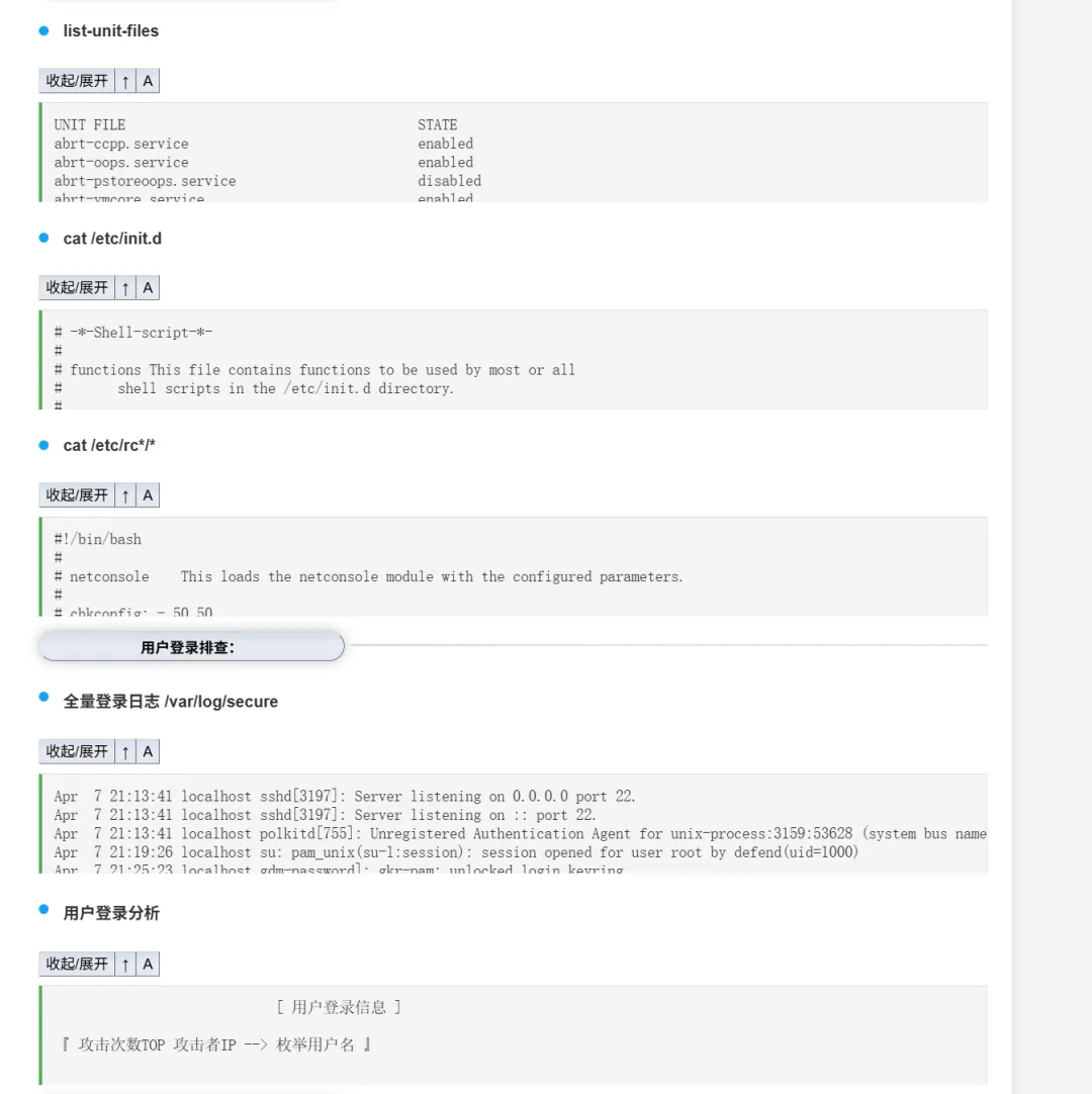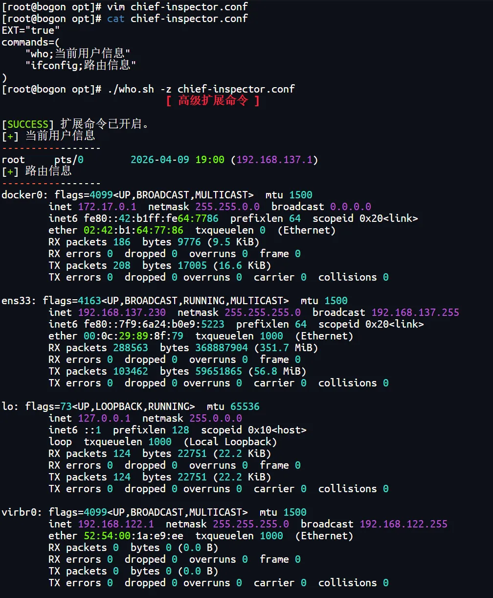 格式:EXT="true"commands=( "who;当前用户信息" "ifconfig;路由信息")