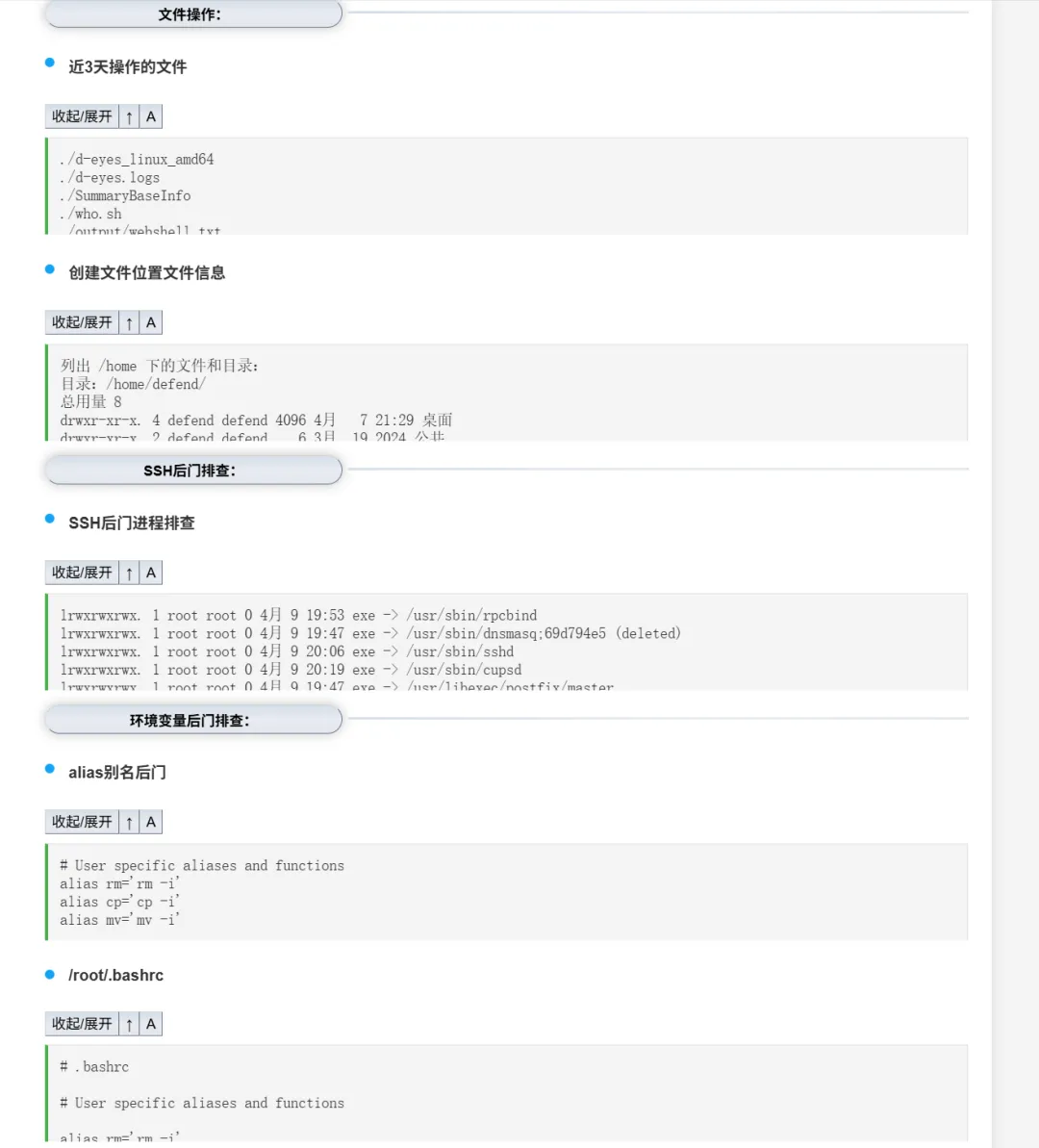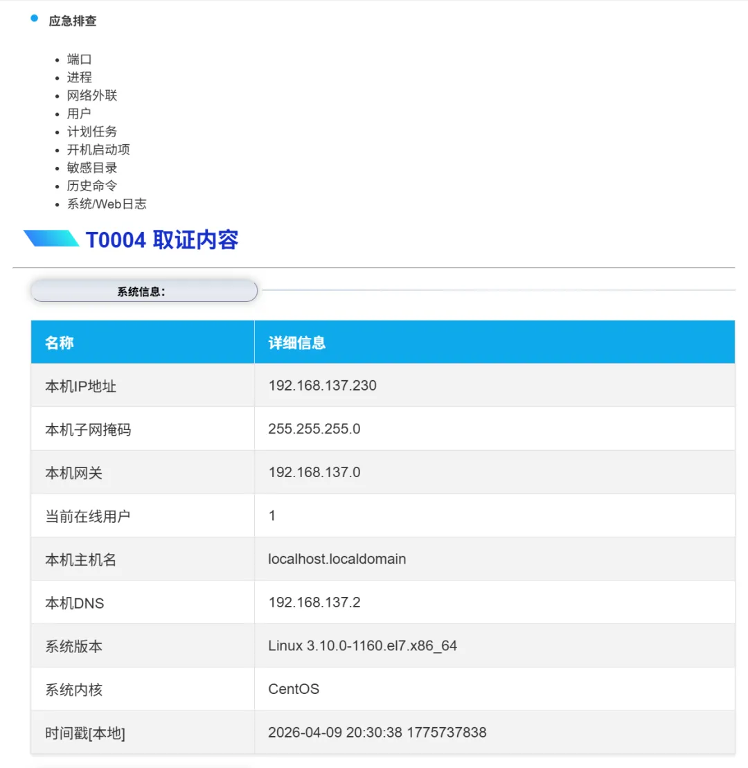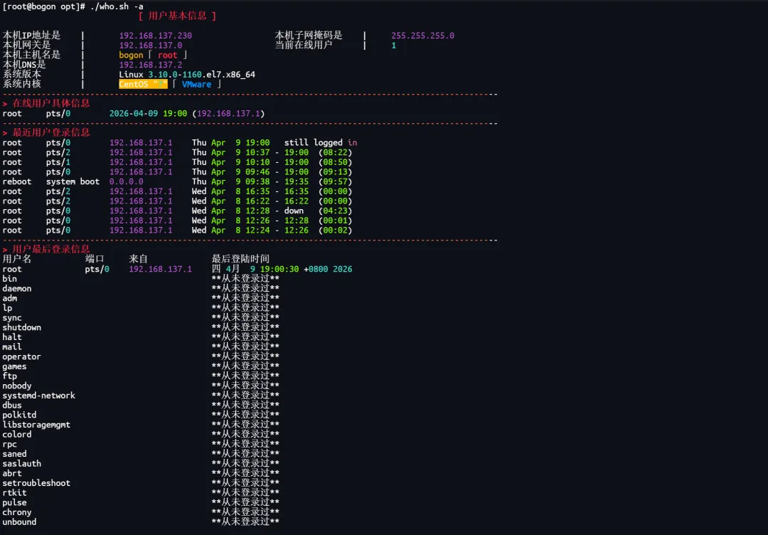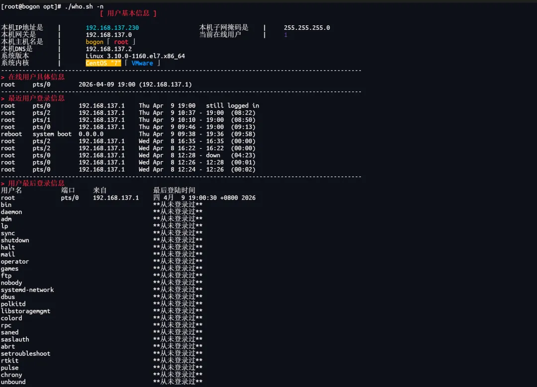 格式:EXT="true"commands=( "who;当前用户信息" "ifconfig;路由信息")