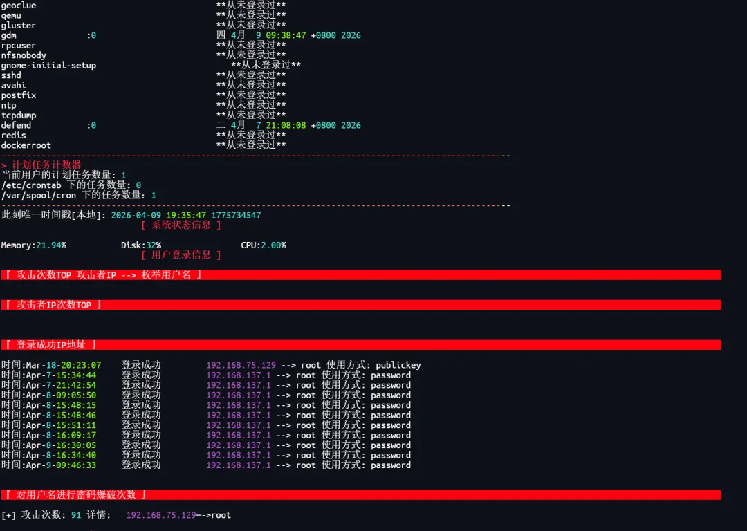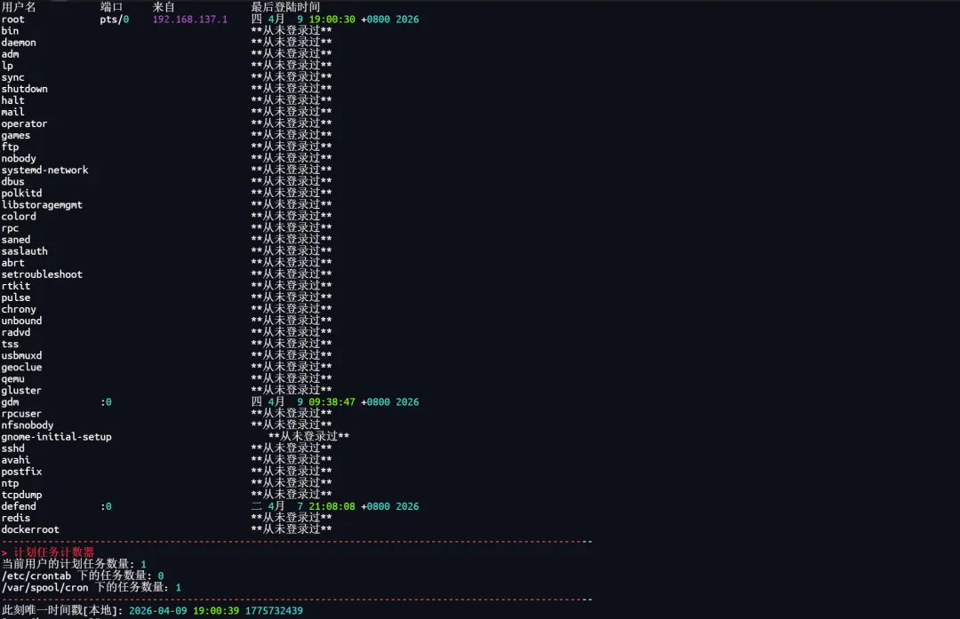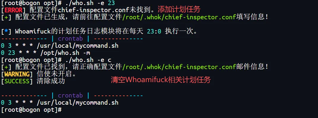 ./whoamifuck -e [0-23] # 填入0到23其中一个时间点,默认为0时./whoamifuck -e c # 清空所有whoamifuck定时任务