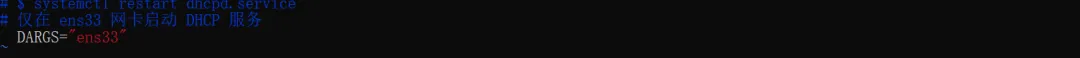 vim /etc/sysconfig/dhcpd修改dhcpDARGS为实际网卡:dhcpDARGS="ens33" # 替换为你的网卡名