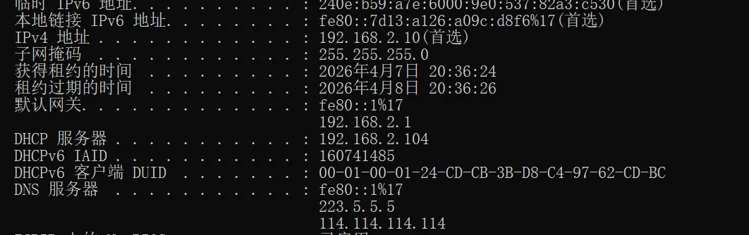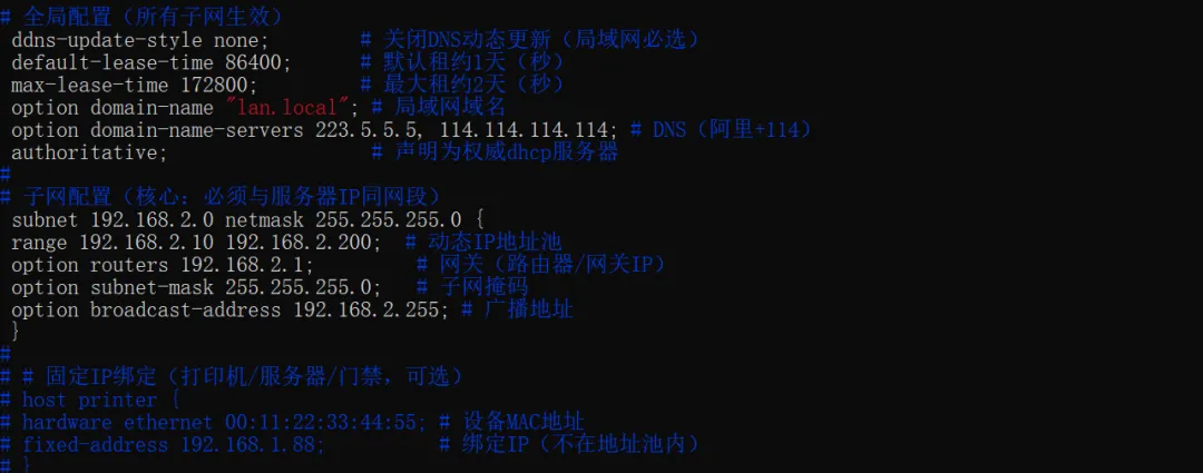 #全局配置(所有子网生效)ddns-update-style none; # 关闭DNS动态更新(局域网必选)default-lease-time 86400; # 默认租约1天(秒)max-lease-time 172800; # 最大租约2天(秒)option domain-name "lan.local"; # 局域网域名option domain-name-servers 223.5.5.5, 114.114.114.114; # DNS(阿里+114)authoritative; # 声明为权威dhcp服务器#子网配置(核心:必须与服务器IP同网段)subnet 192.168.2.0 netmask 255.255.255.0 {range 192.168.2.10 192.168.2.200; # 动态IP地址池option routers 192.168.2.1; # 网关(路由器/网关IP)option subnet-mask 255.255.255.0; # 子网掩码option broadcast-address 192.168.2.255; # 广播地址}#固定IP绑定(打印机/服务器/门禁,可选,根据实际情况配置)#host printer {#hardware ethernet 00:11:22:33:44:55; # 设备MAC地址#fixed-address 192.168.1.88; # 绑定IP(不在地址池内)}