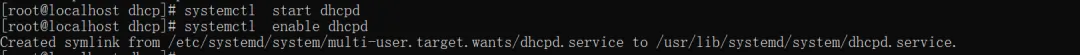 #启动服务systemctl start dhcpd#开机自启systemctl enable dhcpd#查看状态systemctl status dhcpd#重启(修改配置后必执行)systemctl restart dhcpd