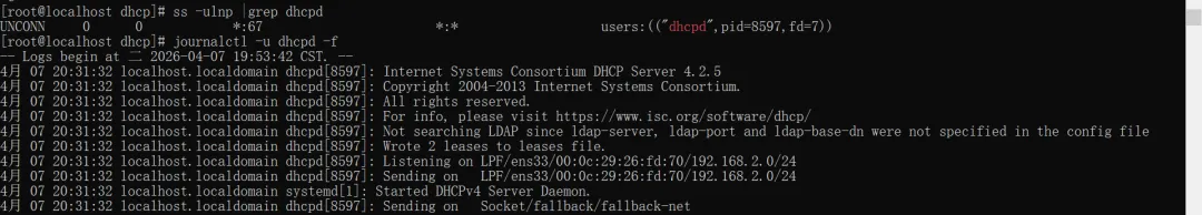 1. 服务端验证#检查端口监听(看到UDP 67即正常)netstat -ulnp | grep dhcp#实时查看日志(排错神器)journalctl -u dhcpd -f
