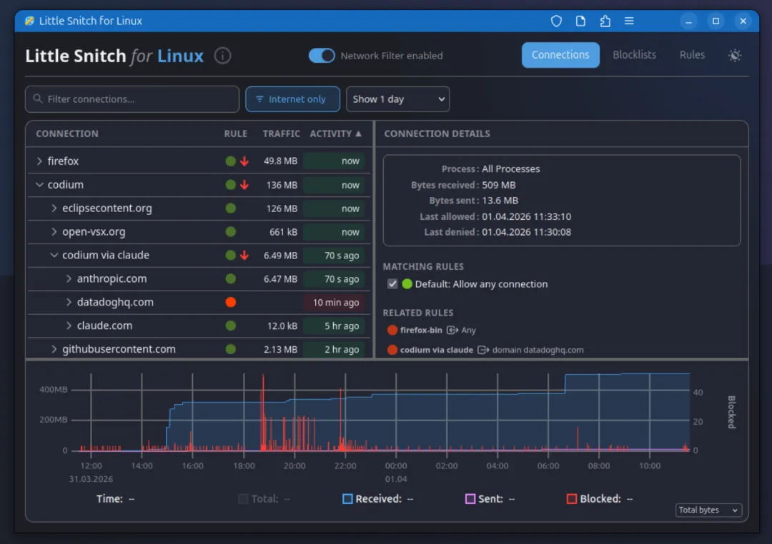 Little Snitch for Linux 是一款网络监控工具,利用 eBPF 技术监控应用程序的网络连接,可视化展示连接活动,支持阻止未授权连接和监控流量历史。兼容 Linux 内核 6.12+,提供 Web 界面和阻止列表功能,守护进程为专有软件但免费使用,适合监控合法软件网络活动但不适合防御高级攻击。