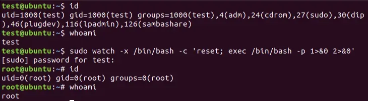 sudo watch -x /bin/bash -c 'reset; exec /bin/bash -p 1>&0 2>&0'